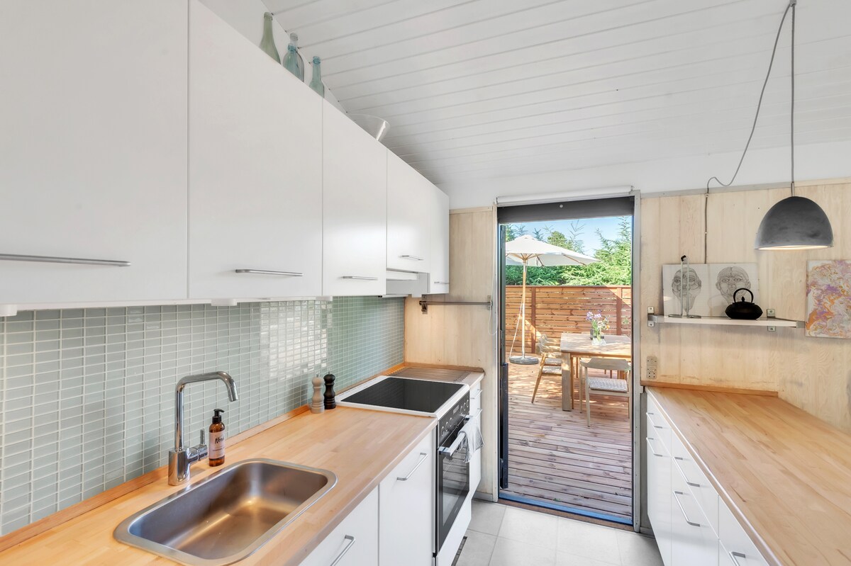 Teachín álainn iontach nua-athchóirithe atá suite sa 2ú sraith ón bhfarraige le radhairc ar an bhfarraige agus cúpla méadar ón trá. Mór agus fairsing. Pearsanta agus athchóirithe i ndáil le bunús an tí sna 70í. Seomra mór oscailte cistine agus itheacháin atá ceangailte leis an seomra suí. Téigh amach chuig lochtán mór agus chuig an ngrian ar an talamh ó mhaidin go tráthnóna. Ceantar álainn gar do Havnebyen agus don bhád farantóireachta.