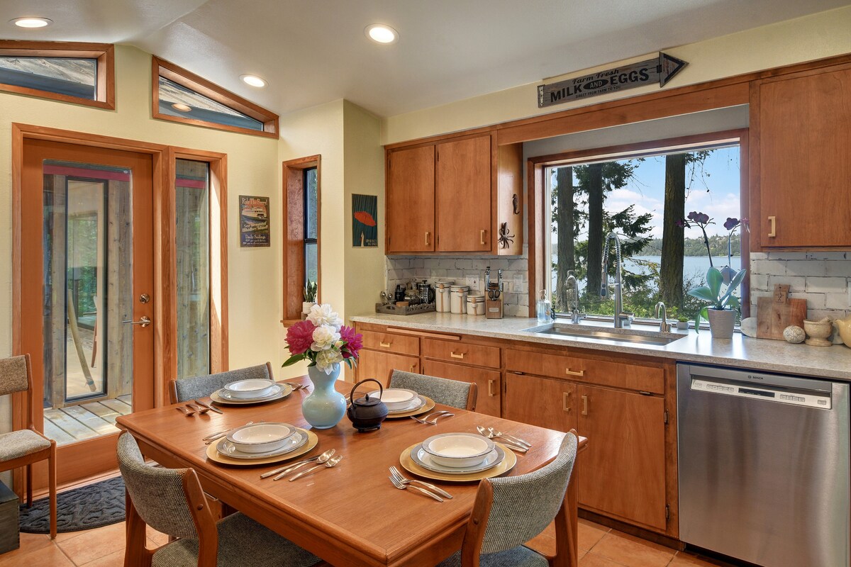 Cábán teolaí cois uisce ar an bhFuaim Puget ar acra príobháideach le cosán chuig an trá. Is iad na tuairimí dochreidte - an Canáil Hood, na Sléibhte Oilimpeacha agus an Spit Thuaidh. Tá an tírdhreach faoi dhraíocht le gairdín aibí: rhodies, azaleas agus mapaí Seapánacha. Is spéir fhoirfe é an teach ina bhfuil máistirsheomra leapa fairsing, seomra leapa, seomra beag agus lochta. Lig do scíth ar an deic nó téigh go dtí an trá beidh tú ag scaradh na síochána agus ciúin, an t - uisce agus na radhairc. Níl ach 20 nóiméad ó bhád farantóireachta Kingston.