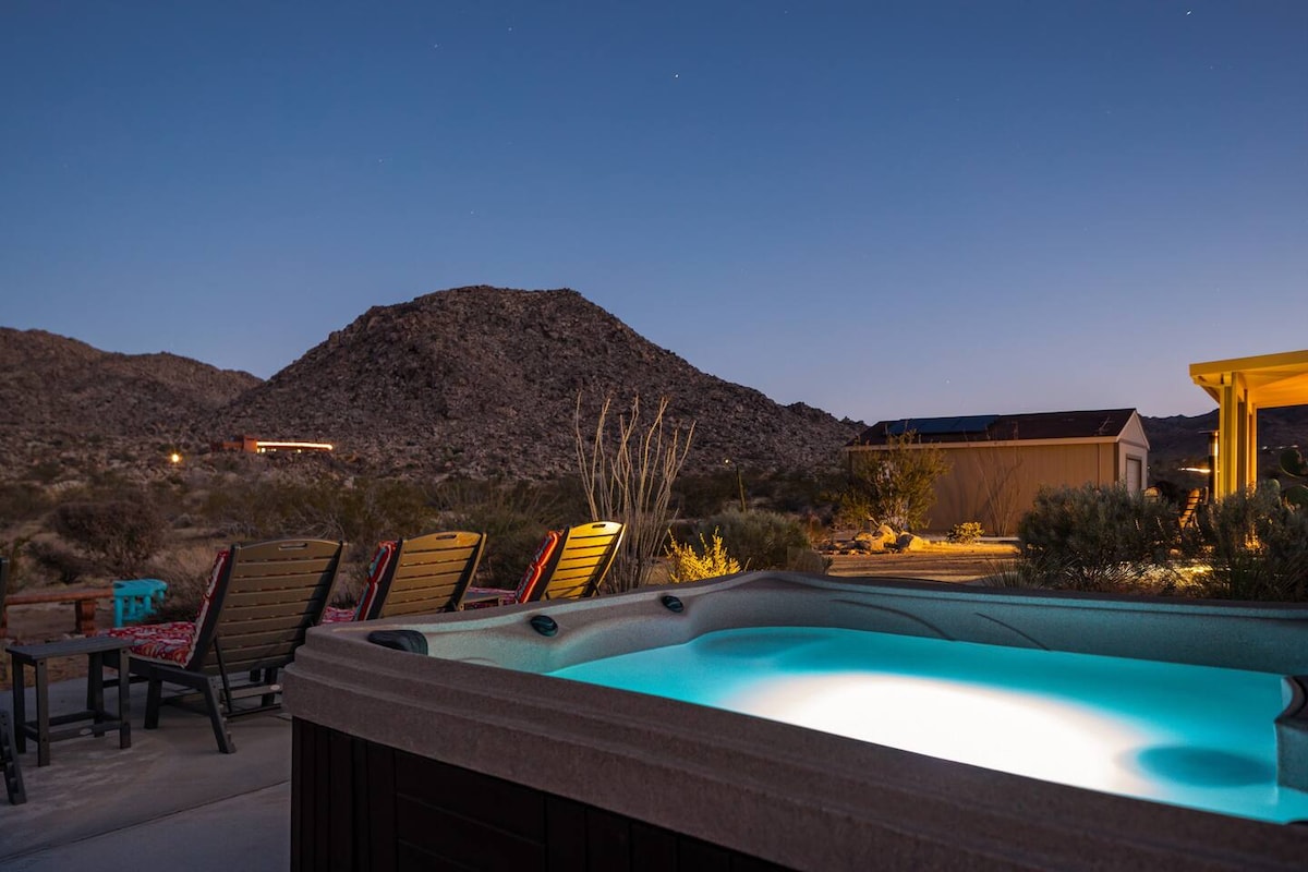 Fáilte go Villa Champagne—d'óasais fhásach phríobháideach atá deartha le haghaidh maidineacha malla, tráthnóna teolaí agus oícheanta réaltaí a bheidh dearmadta agat. Suite ar dhá acra shuaimhneacha nach bhfuil ach cúpla nóiméad ó Pháirc Náisiúnta Joshua Tree, tugann an tearmann uasghrádaithe seo cuireadh duit do scíth a ligean sa tobán te, taitneamh a bhaint as scannáin faoi na réaltaí, do scíth a ligean in aice leis an tine, agus taitneamh a bhaint as suaimhneas an fhásaigh. Cruthaíodh gach cúinne go cúramach chun d'fhanacht a fheabhsú agus tú a cheangal leis an áilleacht mórthimpeall ort.