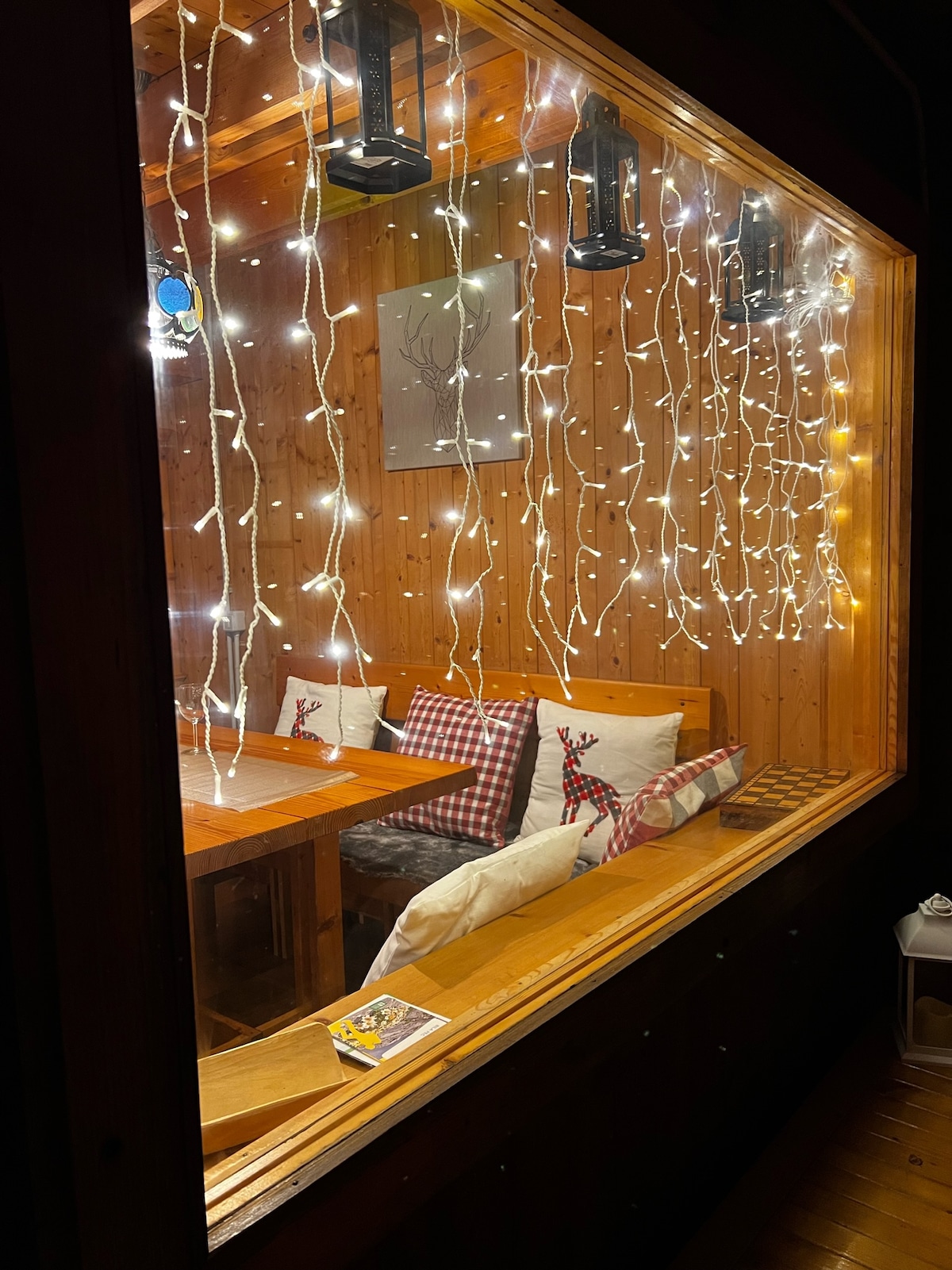 Is é an chuid lárnach den teach Alpach i séasúr an tsamhraidh ná ardán mór adhmaid le cathaoireacha deice agus tobán adhmaid le huisce te (feadán te), a oibríonn sa gheimhreadh freisin. Taobh istigh den teach tá áit chónaithe níos lú ina bhfuil leithris agus dhá leaba ar an gcéad urlár. Le cistin bheag is féidir leat béilí a ullmhú i rith na bliana, agus i séasúr an tsamhraidh, tá cistin samhraidh ar fáil freisin Tá sabhna príobháideach Fionlannach sa teach alpach freisin. Tomhaiseann an teach 50 méadar cearnach.