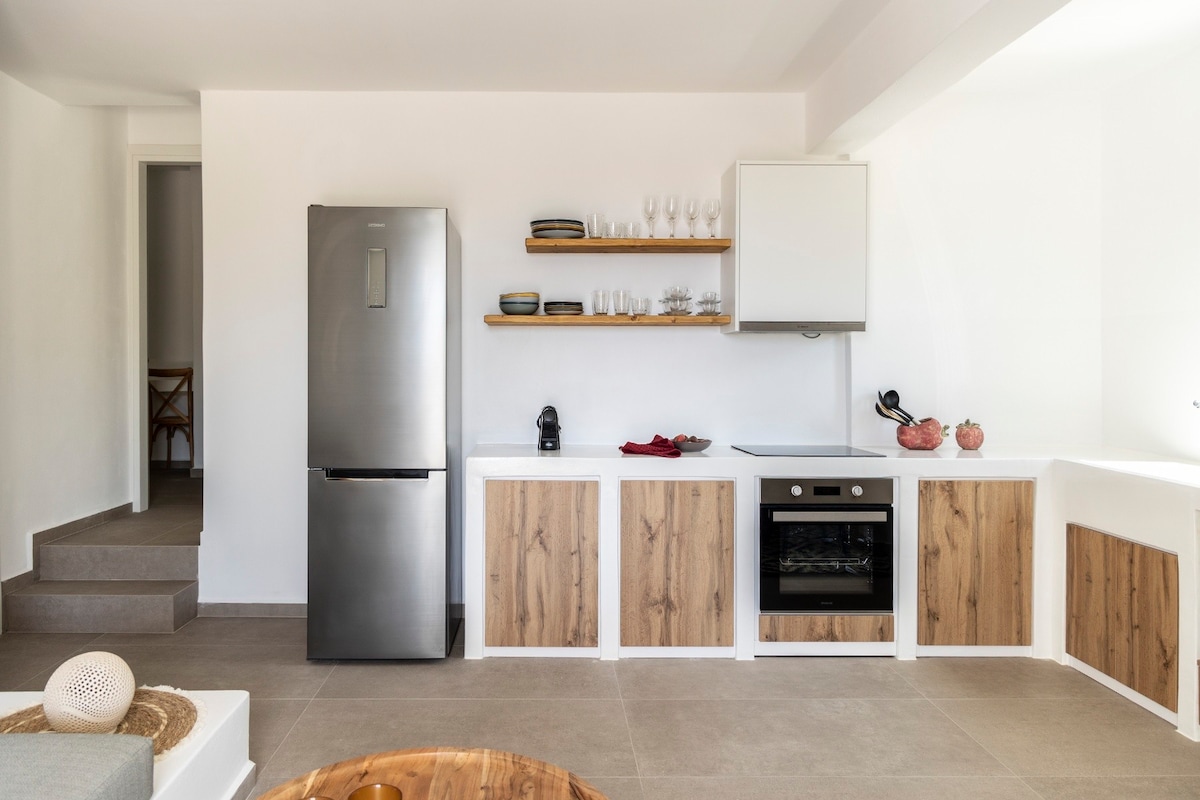 Tá an teach 55 méadar cearnach seo atá cairdiúil don chomhshaol suite 18 nóiméad sa charr ó chalafort Tinos, ar an taobh thiar den oileán, neadaithe i ngarrán olóige agus cliathánach le tírdhreach creagach agus radharc ar an Muir Aeigéach. Athdhearadh an teach feirme traidisiúnta seo i stíl íosta. Tá an spás oiriúnach do lánúin ar breá leis an tír ina gcónaí agus príobháideacht. Tugann sé deis do scíth a ligean ó shaol na cathrach, agus athcheangal a dhéanamh le simplíocht agus suaimhneas an dúlra agus an aireachais.