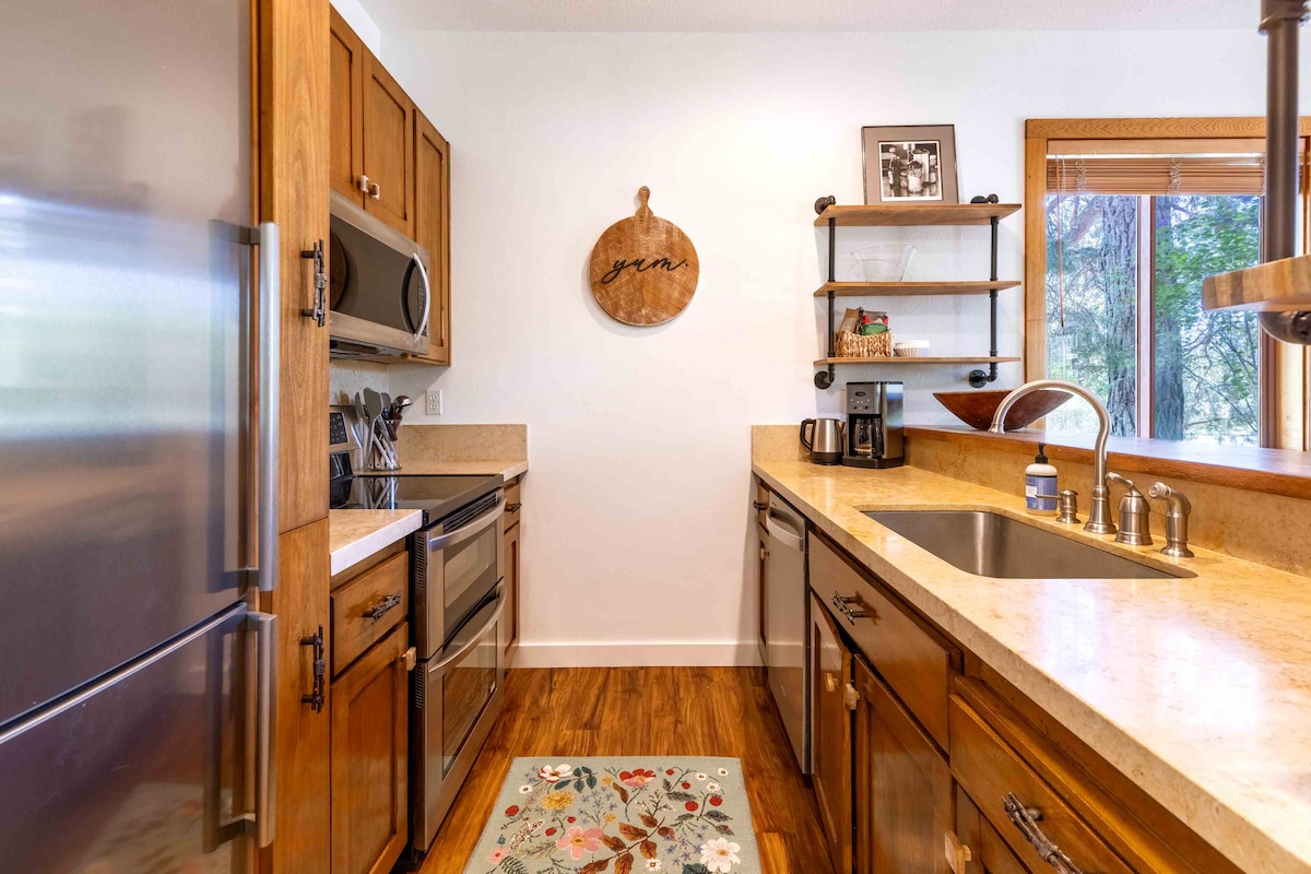 TAKE AN ADVENTURE IN LUXURY, Pack your bags for a water front get-away on the river. Lovely patio to watch the river flow by with your morning coffee. Peek-a-boo view of Payette Lake, beautiful mt. views. Cuddle up to a cozy fireplace on those cool nights. Relax! Unwind! Book a "SPA" appointment with "THE COVE" at Shore Lodge. Walk 2 blks to Rotary Park and the lake. Bike path starts in one blk. 1650 sq. ft. of living space, comfy beds. Book now. Garage parking. Perfect location.