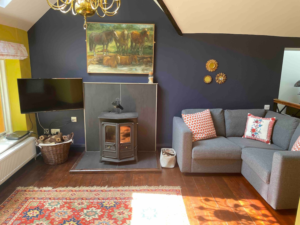 Tagann traidisiúnta le chéile nua - aimseartha sa Teachín Feirme seo atá athchóirithe go hiomlán agus atá suite ar ghabháltas oibre. Seomra leapa lochta fairsing ina bhfuil cúinne cluthar léitheoireachta ag breathnú amach ar pháirceanna agus ar ainmhithe, agus líonann radhairc dhrámatúla sléibhe agus gleanna na fuinneoga le solas. Tógtha le hadhmad agus cloch a fhaightear go háitiúil, agus atá críochnaithe le caibinéadacht shaincheaptha agus feistis cheardaí, is tearmann uathúil é - foirfe tar éis fánaíochta, rothaíochta, saol na feirme, machnamh, nó oícheanta de cheol bríomhar trádála.