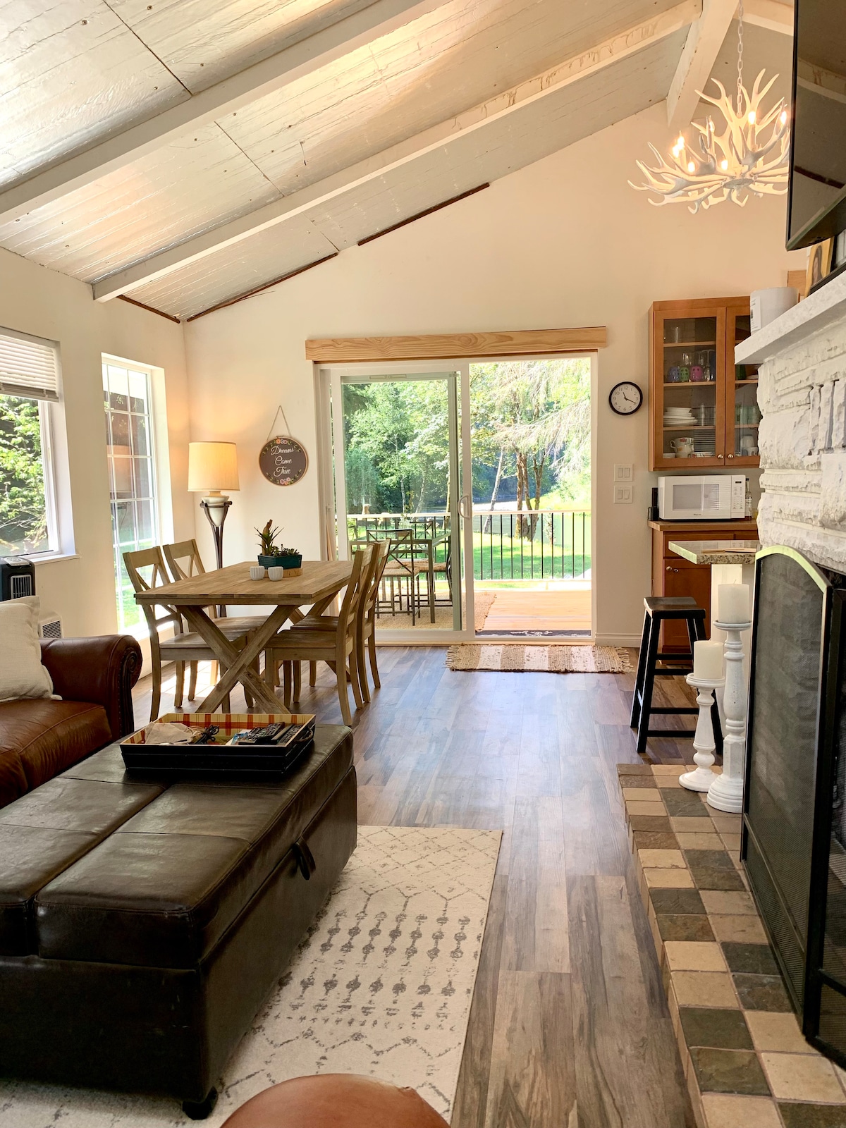 Tum tú féin isteach in áilleacht iarthuaisceart an Aigéin Chiúin ag an teach álainn seo in áit an - uathúil díreach in aice leis an abhainn, múscail éin ag cíoradh agus féach ar na hiolair ag ardú. Tá an teach fairsing agus compordach do dhlúth - shaoire ghearr ón gcathair, duit féin, do chairde agus do do theaghlach. Tá cistin feistithe go maith le haghaidh béilí. Deic mhór ina bhfuil áit itheacháin agus suíocháin le haghaidh bailithe agus tábla poll dóiteáin. Clós cúil mór féir le poll dóiteáin chun cluichí a imirt, teacht le chéile timpeall na tine agus marshmallow a róstadh