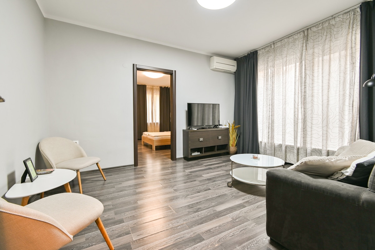 Fan i gcroílár Shóifia, díreach cúpla céim ó Vitosha Boulevard, in árasán compordach dea-fheistithe ina bhfuil dhá sheomra leapa. Foirfe do theaghlaigh, do chairde nó d'aíonna atá ag obair go cianda. Tá an suíomh den scoth: tá NDK, Serdika, Ardeaglais Alexander Nevsky, siopaí, caiféanna, bialanna agus siamsaíocht oíche go léir laistigh d'achar siúil. In ainneoin go bhfuil sé i gcroílár na cathrach, is áit shuaimhneach phraiticiúil é an t-árasán chun do scíth a ligean.