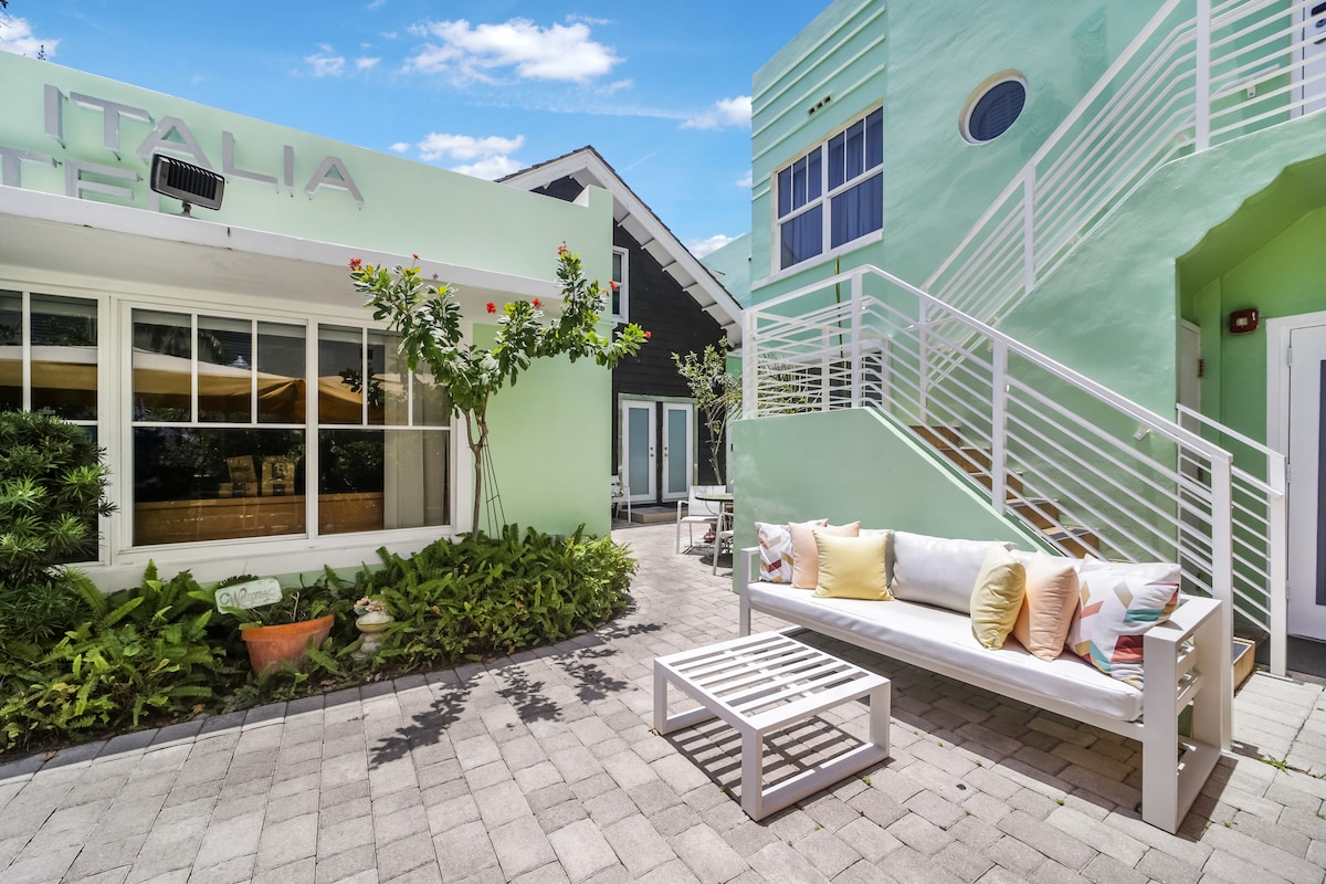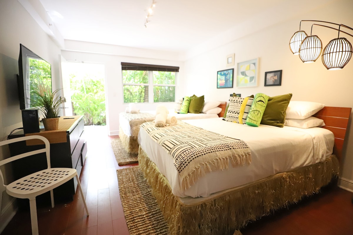 Fan in South of Fifth, an chomharsanacht is gleoite in Miami Beach ach bloc amháin ón trá! Tá leaba rímhéide, Teilifís Chliste, Wi - Fi, AC, spás oibre, cuisneoir, iarann, triomadóir gruaige, & línéadach tí den scoth san aonad cluthar seo. Bain sult as seirbhís seomra, caife sa fhorhalla, fágáil bagáiste, cliabhán ar iarratas, & bia lasmuigh. Foirfe chun do scíth a ligean tar éis lá faoin ngrian. Siúl chuig na bialanna, na páirceanna agus an t - aigéan is fearr i gceann nóiméid. Ar iarratas cuirtear páirceáil ar fáil dhá bhloc ar shiúl ón óstán ag garáiste geataithe ar $ 20/lá.