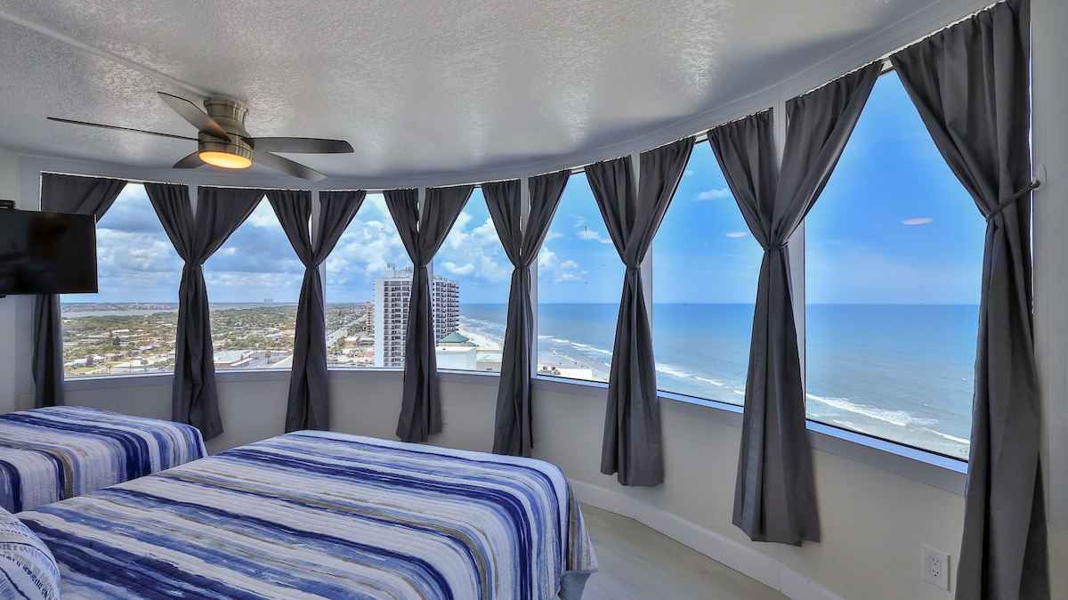 NIGHTLY PRICE REDUCED due to Building renovations restricting our balcony usage. ON THE BEACH! Your very own cozy spacious studio with a private balcony* overlooking the Sand, Surf, and Sunrises. Daytona Shores is the serene beach of Daytona and is just a few short minutes away from a variety of activities and restaurants. Our 3rd-floor unit is completely remodeled with free dedicated 45+Mbps WiFi, streaming channels, a full kitchenette, and free parking. *Unavailable beginning November