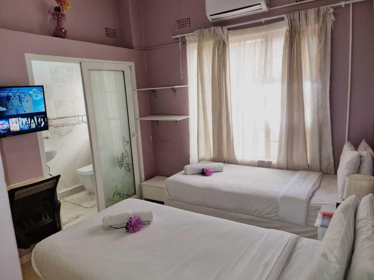 Fáilte chuig ár dTeach Aoi teolaí, glan agus galánta! Suite i gcomharsanacht shuaimhneach lárnach, tá gairdín álainn agus linn snámha úrnua inár bparthas. Bain sult as béile inár dtearmann trópaiceach ag éisteacht leis na héin agus tú ag súimín tae/caife ar maidin. Tá teilifíseán, aircon, Wi - Fi, & cuisneoir i do sheomra. Táimid ar shiúlóid ghearr ó Riverwalk Mall agus gar do lár na cathrach. Is beirt iníon athar muid a bhfuil dúil mhór againn sa taisteal, le cúnamh iontach ónár gcomhóstach, Tshepo. Táimid ag súil go mór le fáilte a chur romhat!