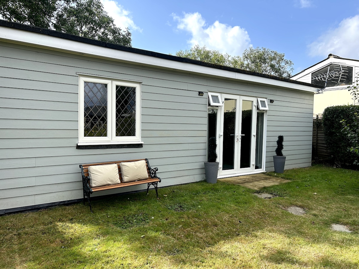 Studio/Cabin with en-suite shower and toilet, kitchen with microwave, fridge, small oven, toaster, kettle, cups and plates provided. Freeview TV, bed linen and towels heating and hot water included. Off road parking with own access to studio, a two minute walk to beach, local shops and Hayling Island beach. Would suit walkers and cyclists to explore the area. Dog allowed. No smoking. A new 5 foot pullout sofa bed has now replaced the old 4 foot bed for a more comfortable, sleeping experience.