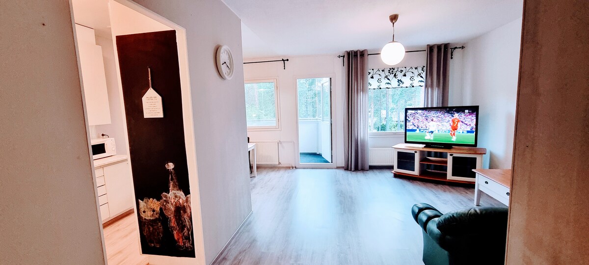 Árasán dhá sheomra (32 m2) atá athchóirithe agus feistithe go hálainn agus atá ceangailte le teach scoite, agus a bhealach isteach féin ag leibhéal na sráide. Is féidir leat fanacht go solúbtha agus go neamhspleách le heochair. Tugaimid rothair ar iasacht duit saor in aisce (2) más gá. Bíodh snámh ar maidin agat (100 m ón trá) nó téigh ag bogshodar! Tosaíonn cosáin bogshodair béal dorais. Tabhair sup - board, cadhc nó bád rámhaíochta ar iasacht saor in aisce ó Urpola NatureCenter (200 m). Earraí grósaera, cógaslann, giomnáisiam laistigh d'achar siúil, lár na cathrach 1.5 km, Ceoláras Mikaeli 3 km.