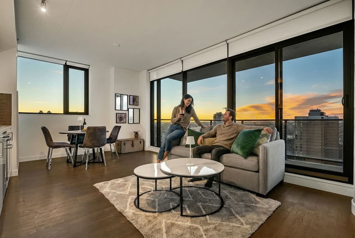 Fáilte go dtí ár n - árasán aonad cúinne iontach i lár Calgary! Tugann an tearmann nua - aimseartha seo an meascán foirfe duit de áisiúlacht, só agus radhairc iontacha. Agus tú ag teacht isteach, beidh tú faoi dhraíocht láithreach ag na fuinneoga ó urlár go síleáil a thaispeánann spéirlíne iontach na cathrach agus vistas sléibhe maorga. Bí ar an eolas faoi dhoirse tosaigh ghlas an fhoirgnimh ag 10pm. Má dhéanann tú áirithint, beidh ort an eochair/sab a bhailiú in áit dhifriúil. *** Tá an LINN snámha dúnta don gheimhreadh.