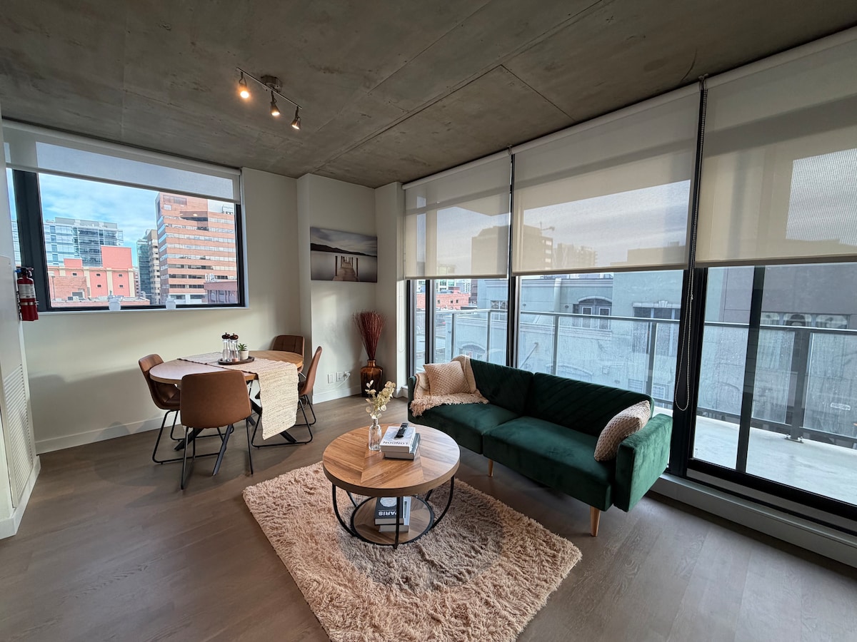 Fáilte go dtí ár n - árasán aonad cúinne iontach i lár Calgary! Tugann an tearmann nua - aimseartha seo an meascán foirfe duit de áisiúlacht, só agus radhairc iontacha. Agus tú ag teacht isteach, beidh tú faoi dhraíocht láithreach ag na fuinneoga ó urlár go síleáil a thaispeánann spéirlíne iontach na cathrach agus vistas sléibhe maorga. Bí ar an eolas faoi dhoirse tosaigh ghlas an fhoirgnimh ag 10pm. Má dhéanann tú áirithint, beidh ort an eochair/sab a bhailiú in áit dhifriúil. *** Tá an LINN snámha dúnta don gheimhreadh.