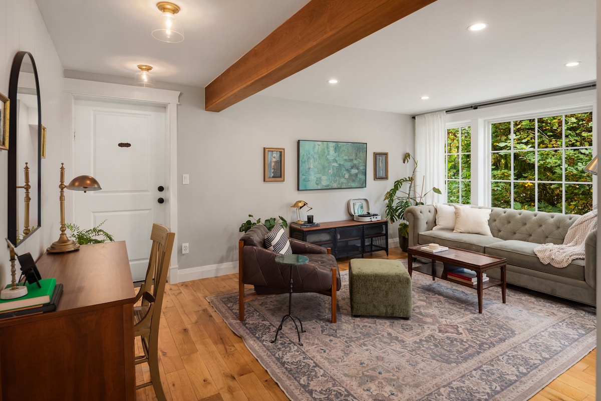 Tugann turas suaimhneach farantóireachta 20 nóiméad ó West Seattle nó Water Taxi ó Downtown Seattle chuig do theachín teolaí príobháideach féin, Stiúideo le radhairc scuabtha ar an bhFuaim. Féach ar na báid farantóireachta ag dul, scíth a ligean, ar shiúl ó na hustle agus bustle na cathrach. Bain sult as sunsets iontacha thar na sléibhte Oilimpeacha, cadhcáil, cosán fánaíochta foraoise le radhairc farraige agus Mount Rainier, siúlóidí trá, agus Downtown Vveral (níos lú ná 10 nóiméad ar shiúl!). Tabhair faoi deara: Tá an carrchlós cúpla nóiméad siúil ón teachín.