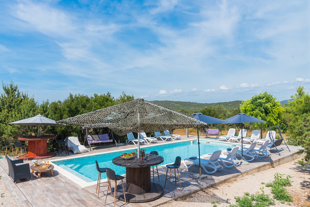 Tum thú féin isteach san eispéireas idyllic Adriatic ag an teach álainn féin - inbhuanaithe seo atá suite ar Oileán Pakleni, TURAS BÁID 15 NÓIMÉAD Ó HVAR. Téigh amach ón ngreille agus tú timpeallaithe ag an dúlra. Tá an trá chúlráideach 5 nóiméad ar shiúl, áit ar féidir leat taitneamh a bhaint as roinnt suaimhneas agus ciúin agus tú ag cur na gréine ar maos agus ag snámh in uisce turcaidghorm soiléir an Oileáin. Críochnaigh do lá trí shiúl chuig an Palmizana agus bia a ithe ag bialann a fhreastalaíonn ar speisialtachtaí cócaireachta áitiúla!