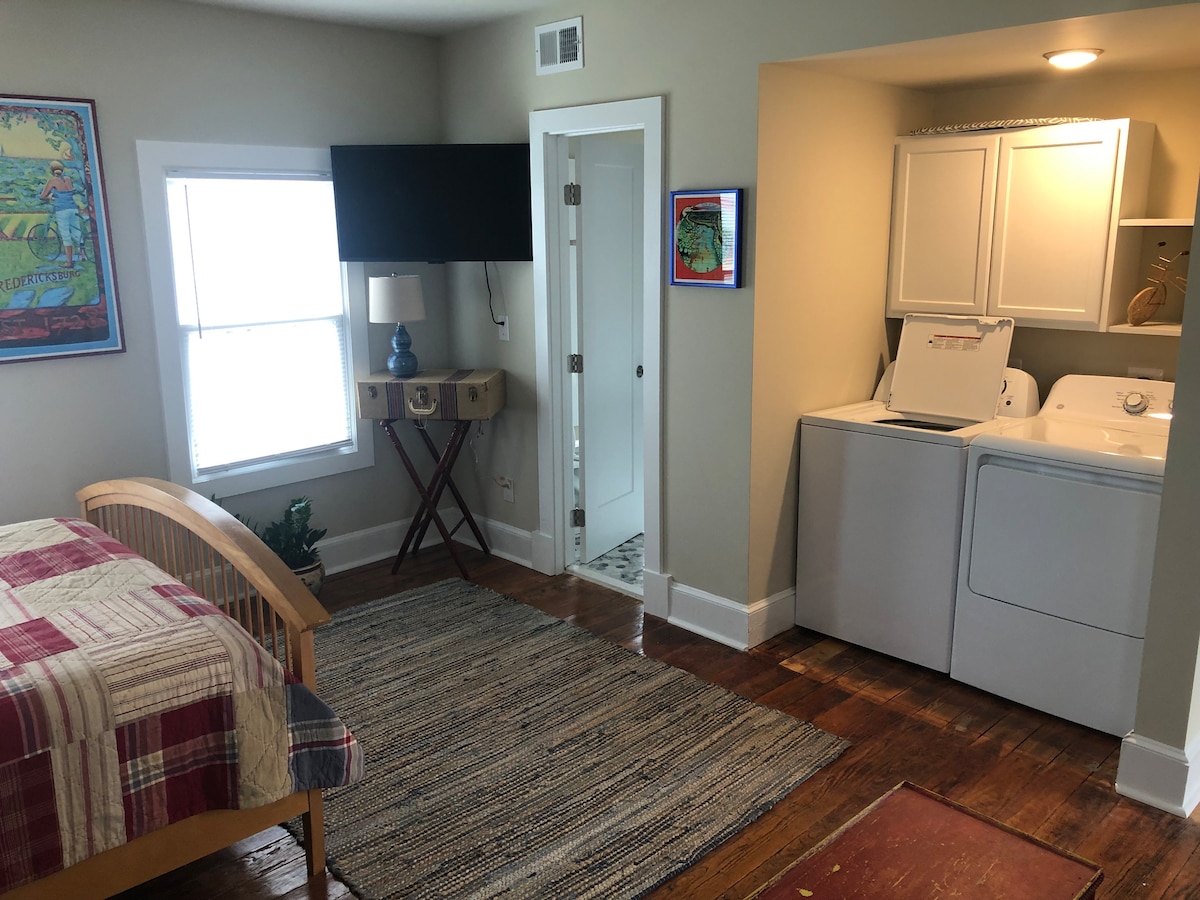 An chuid eile i gcroílár bhaile Fredericksburg! Fanfaidh tú in árasán ar leibhéal níos ísle an tí stairiúil seo. Tógtha le linn na Réabhlóide, agus a úsáidtear mar ospidéal le linn an Chogaidh Chathartha, tá an teach seo díreach trasna ón ionad cuairteoirí, laistigh de chéimeanna sainchomharthaí, bialanna iontacha, sconna, agus siopaí. Is é seo an áit fhoirfe le haghaidh deireadh seachtaine ar shiúl nó turas stairiúil. Tá Páirc Tosaigh na hAbhann nua - thógtha suite ar chúl na réadmhaoine agus tá sí iontach do na cinn bheaga.