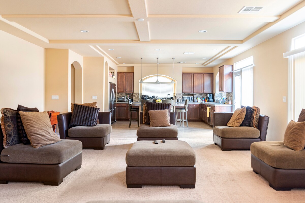 Éalú ó Vegas atá oiriúnach do theaghlaigh díreach 15 nóiméad ó The Strip, Downtown, Fremont, Arts District, Convention Center & Speedway - le rochtain thapa saorbhealaigh! Bain sult as linn snámha gréine (samhradh), Spa, gríoscán beárbaiciú, bia lasmuigh, 3 sheomra folctha iomlána!, agus clós álainn tírdhreachaithe. Taobh istigh: leagan amach oscailte le solas iontach, gloine dhaite, luchtaire feithiclí leictreacha, cluichí boird, teilifíseáin chliste, agus go leor spáis. In aice le Red Rock, Mt. Charleston, páirceanna, siopadóireacht & bia. Lig do scíth agus bíodh spraoi agat - beidh dúil mhór agat anseo!