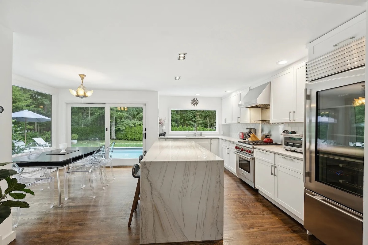 Teach Feirme Nua-Aimseartha Oasis | Linn Snámha Phríobháideach | In Aice le Hamptons & North Fork Éalaigh chuig tearmann galánta ina dtagann dearadh nua-aimseartha le mealltacht thuaithe le chéile. Suite ar thalamh príobháideach acra amháin, is sárshaothar é an teach feirme seo maidir le maireachtáil cois cósta. Bain sult as áiteanna suí faoi sholas na gréine, as linn snámha lonrach agus as sómas buan fionnuar ghaotha an Atlantaigh. Ar an taobh istigh, tá meascán gan stró d'intairí comhaimseartha agus Wi-Fi ardluais sa teach—foirfe do thearmann suaimhneach nó do shaoire “oibrigh ó áit ar bith”.