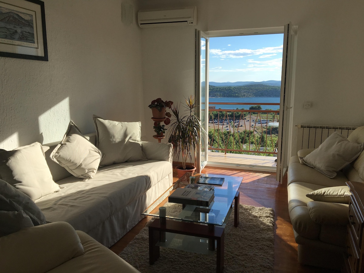 Árasán galánta le radharc álainn ar an gcathair agus ar na hoileáin. Agus gairdín beag os comhair an tí agus ardán mór le luascáin do leanaí agus bord mór inar féidir leat taitneamh a bhaint as radharc iontach ar an seanbhaile, ar an oileán agus ar NP Kornati. Tá an trá Banj 5 nóiméad i gcarr/20 nóiméad ag siúl, tá spás páirceála saor in aisce agat. Ón trá tá Banj 10 nóiméad siúil go dtí an t - ionad. Tá an t - ollmhargadh 5 nóiméad sa charr, chomh maith leis sin tá siopa beag & bácús 5 nóiméad ag siúl ón teach.