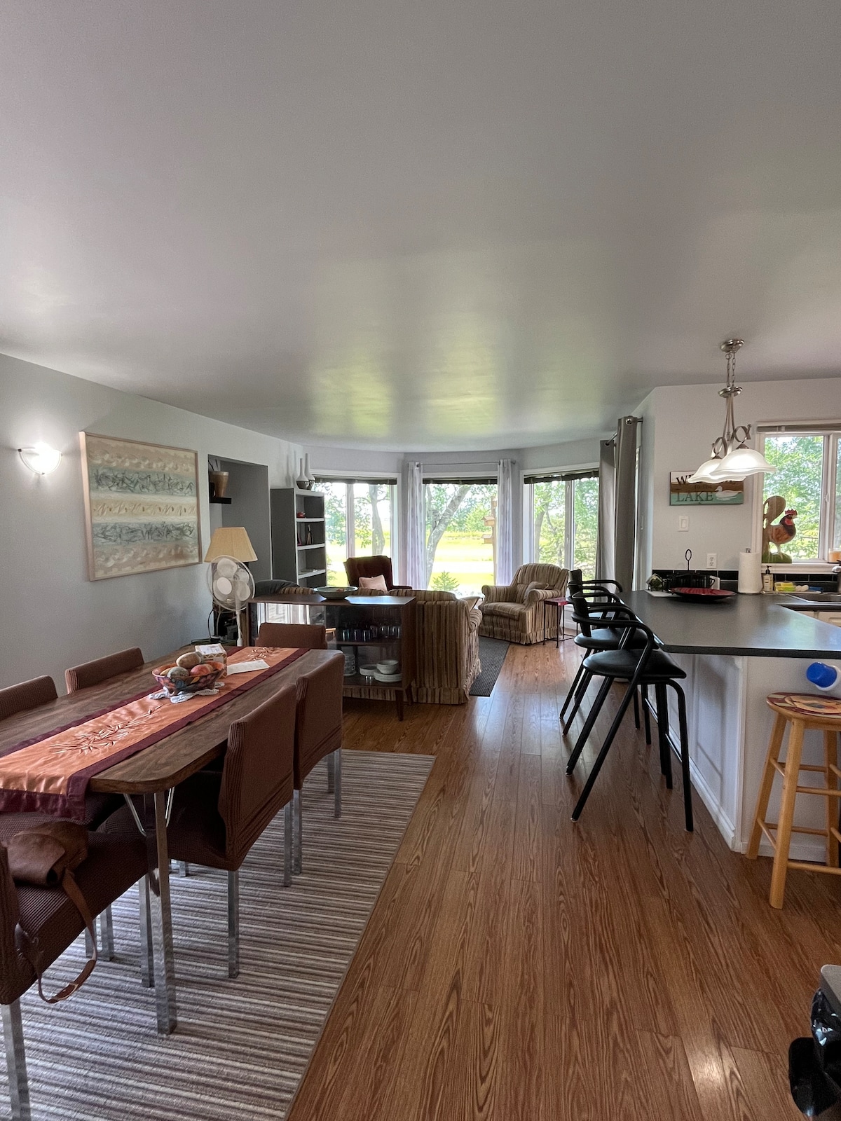 Teach cois uisce ceithre shéas suite ar réadmhaoin aon acra le 300' de imeall uisce. Tá an teach 1400 troigh cearnach faoi throscán deas agus feistithe go maith. 3 limistéar deic mhóra agus duga 60 troigh le rochtain ar lainseáil báid. BBQ gáis, limistéar mór poll tine. Tá 2 láithreán RV lánseirbhísithe ar fáil freisin. Bain sult as snámh, bádóireacht, cadhcáil, clársheoltóireacht, iascaireacht srl. Galfchúrsa den scoth, bialanna, siopa grósaera/stáisiún peitril díreach cúpla nóiméad ar shiúl. Tá óstaigh ina gcónaí in aice láimhe chun go mbeidh sé níos áisiúla duit. Ní bhíonn lóistín ar cíos ach ar feadh 7 lá le linn an bhuaicshéasúir.