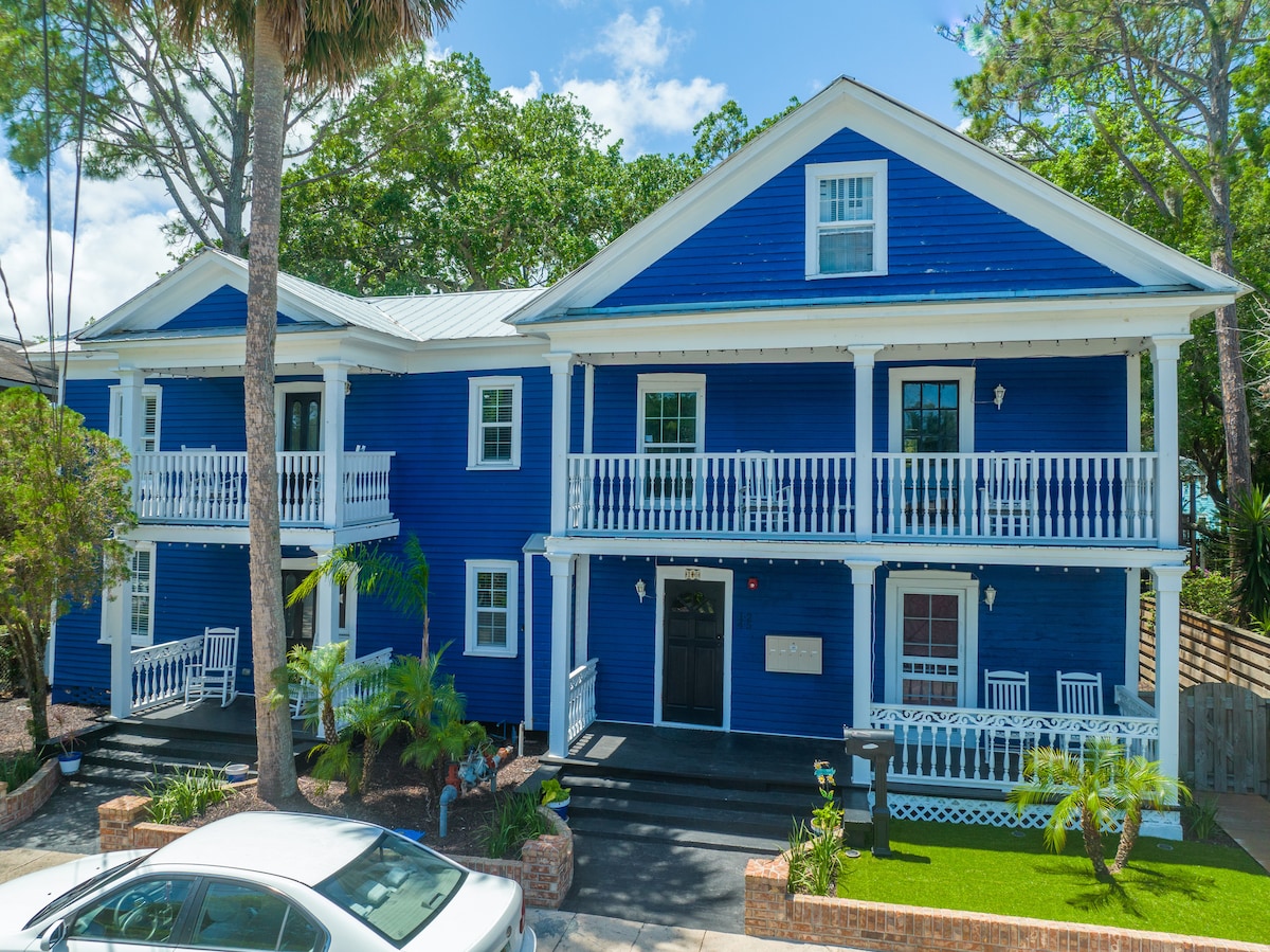 Páirceáil Lasmuigh den tSráid le haghaidh 2 fheithicil Siúl 2 nóiméad go Sráid Sheoirse 5 nóiméad sa charr go Trá Pháirc Stáit Anastasia 6 Min tiomáint chuig Club Aclaíochta/Linn Snámha Idirlíon Starlink Ardluais Luxury Retreat in Downtown Stairiúil. Bain sásamh as lóistín saoire ar cíos ina bhfuil seomra suí fairsing, cistin ghalánta, agus folcadáin shómasacha. Tum thú féin sa stair shaibhir agus sa chultúr bríomhar, lena sráideanna gleoite agus nithe is díol spéise áitiúla. Cibé an bhfuil tú ag lorg eachtraíochta nó scíthe, cuireann an tearmann seo an bonn foirfe ar fáil.