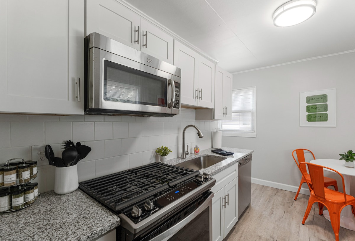 Aonad ar an gCéad Urlár. Síleálacha fairsinge 11 troigh, Tá an stiúideo nua-athchóirithe seo suite "Ar oileán" Soulard ina bhfuil 23+ bialainn / beár laistigh d'achar siúil. Nóiméad go dtí lár na cathrach, Gateway Arch, cluiche baseball na gCardinals agus nithe is díol spéise eile ar thuras gairid 2 nóiméad $5 Uber/tacsaí. - Doirse isteach tosaigh agus cúil príobháideacha. - Rochtain eochaircheapa / dul isteach gan eochair. -16 Soilse faoi stiúir Comhthimpeallachta Datha - Teilifís chliste HDTV 44" cuasaithe. - Eas Seomra Folctha / Cith Báistí