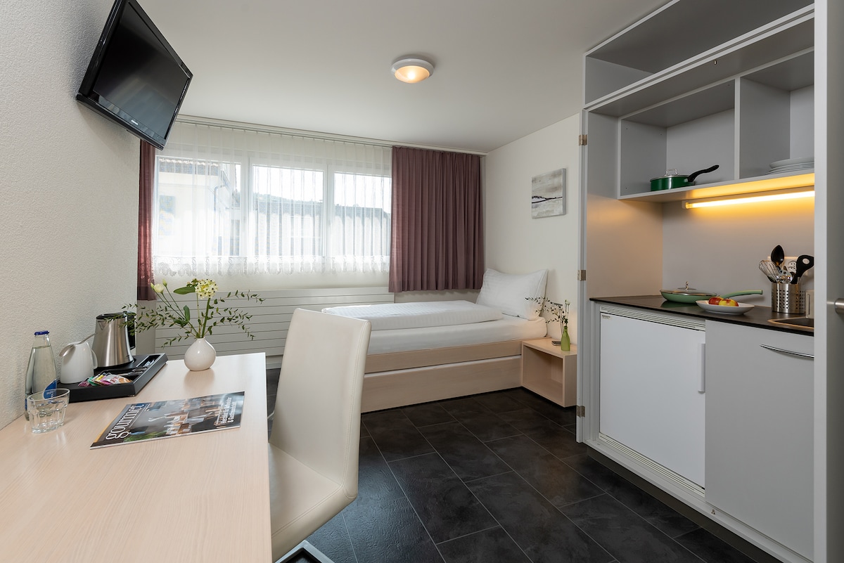 Herzlich Willkommen in unserem kleinen traditionsreichen Hotel, familiäres Umfeld und persönlich geführt. Im Studiozimmer mit Kochnische hast Du Deine kleine eigene Wohnung. Auf Wunsch und Aufpreis ist das Frühstück im Hotel möglich. Einkaufsmöglichkeiten, Restaurants, Bus- und Bahn sind nur wenige Schritte von uns entfernt. Parkieren kannst Du kostenfrei. Wir freuen uns auf Deinen Besuch.