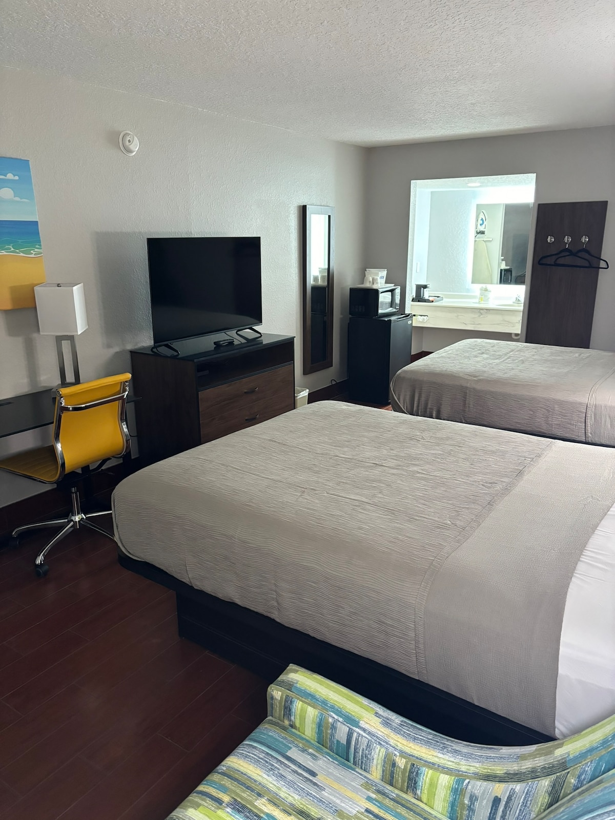 Déan iniúchadh ar an Seomra Vilano ag Haley's Court Boutique Motel. Tá leaba chluthar bhanríona, scáthanna dubha le haghaidh codlata suaimhneach, agus saoráidí riachtanacha amhail déantóir caife Keurig, mionchuisneoir agus teilifíseán cliste le haghaidh siamsaíochta sa seomra seo atá deartha go cúramach. Bain sult as seiceáil isteach gan stró gan teagmháil agus suíomh den scoth nach bhfuil ann ach bloic ón trá agus tiomáint ghearr chuig lár stairiúil St. Augustine. Tum thú féin san atmaisféar seanré agus sa chompord nua - aimseartha a fhágann go bhfuil d'fhanacht fíor - speisialta.