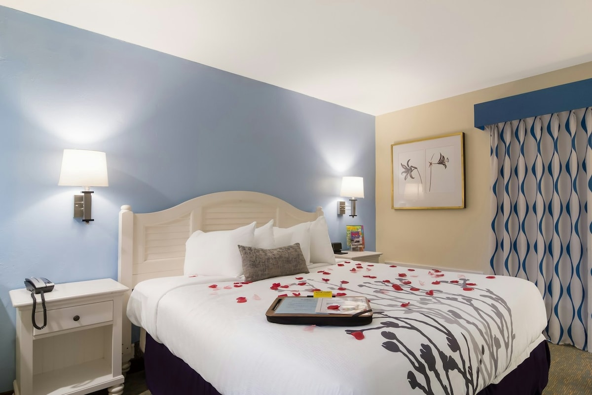 Déan iniúchadh ar an Seomra Palm ag Haley's Court Boutique Motel ar Vilano Beach, Florida. Tá leaba chluthar bhanríona, scáthanna dubha le haghaidh codlata suaimhneach, agus saoráidí riachtanacha amhail déantóir caife Keurig, mionchuisneoir agus teilifíseán cliste le haghaidh siamsaíochta sa seomra seo atá deartha go cúramach. Bain sult as seiceáil isteach gan teagmháil agus suíomh den scoth nach bhfuil ann ach bloic ón trá agus tiomáint ghearr chuig lár stairiúil St. Augustine. Tum thú féin san atmaisféar seanré agus sa chompord nua - aimseartha a fhágann go bhfuil d'fhanacht fíor - speisialta.