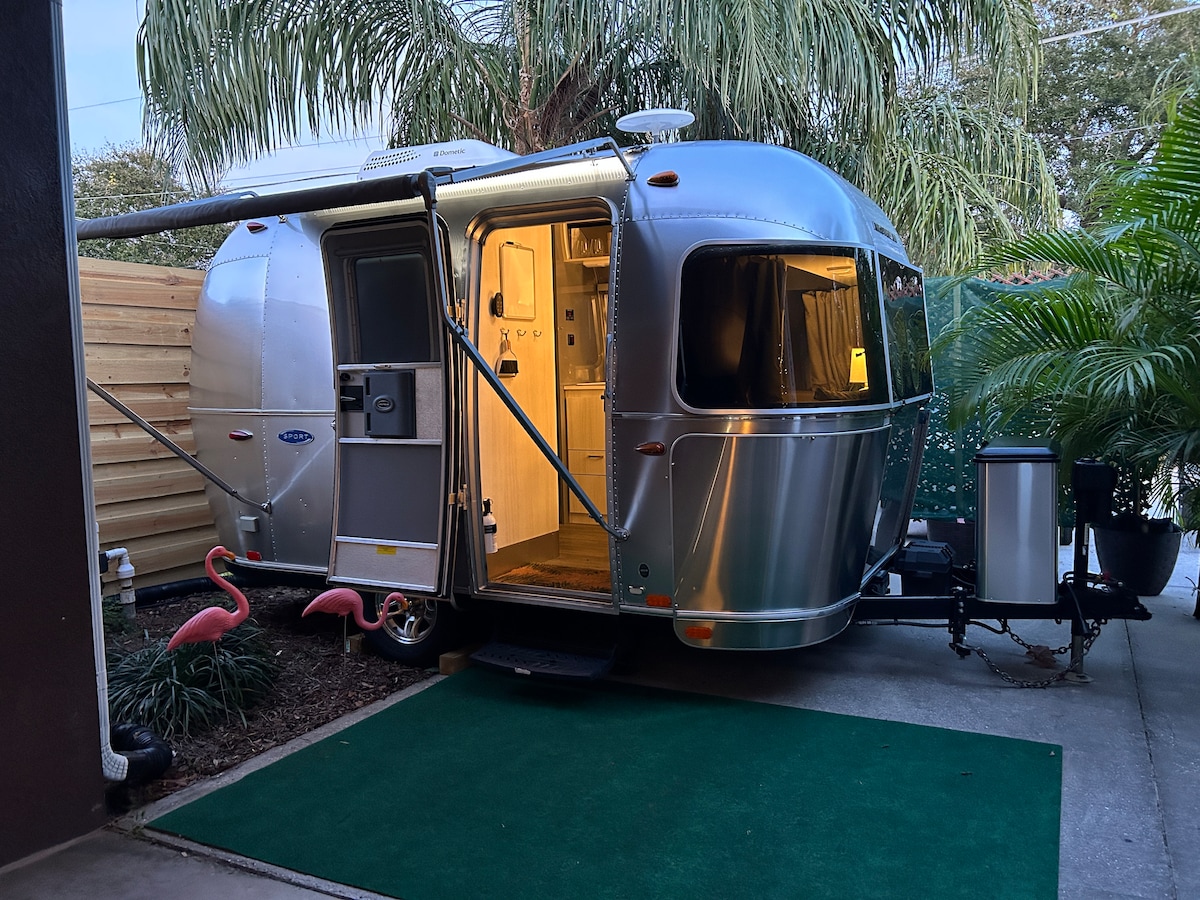 28' Vintage Airstream we call the Yellow Submarine, enjoy this unique experience inspired by The Beatles and furnished with IKEA. The queen bed in a separate bedroom offers comfort and privacy and 1 of 2 tvs. Full bathroom, separate shower, hot plate and grill, thermostatically controlled AC & space heaters. A short 6 minute Uber into downtown or 8 minutes to Viano. Beach. Our 5 star reviews love,location, privacy, firepit, and hottub, private outdooor shower and covered patio.