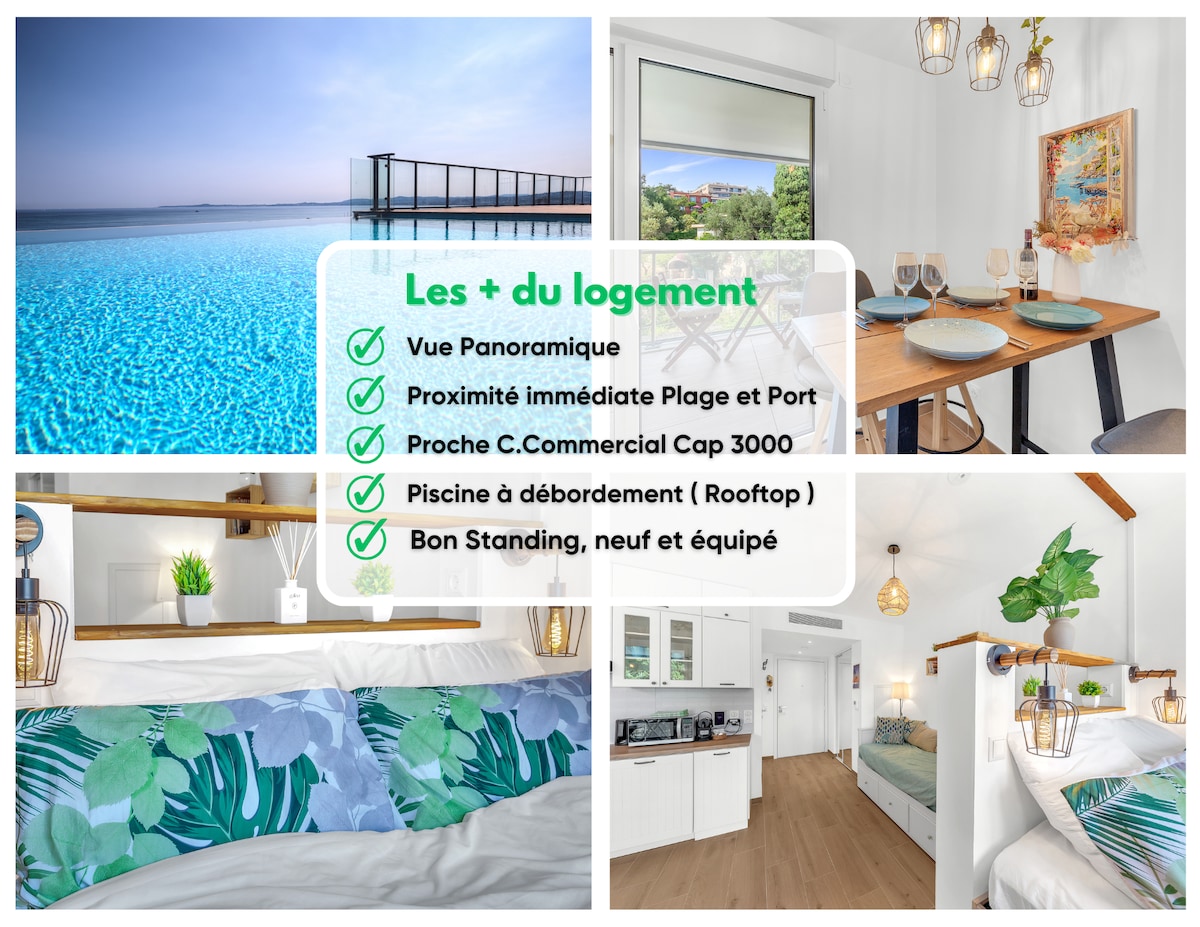 Tá árasán 3 sheomra suite go hidéalach atá os comhair ó dheas/siar ó dheas, ag tairiscint an compord go léir is gá le haghaidh fanacht taitneamhach do bheirt. Tá páirceáil phríobháideach agus gairdín ann ina bhfuil loggia grianmhar chun taitneamh a bhaint as an dea - aimsir. Is siúlóid 15 nóiméad agus turas 5 nóiméad ar shiúl iad an trá agus an t - ionad siopadóireachta CAP3000 faoi seach. Tá an t - aerfort agus an staidiam inrochtana i 6 agus 10 nóiméad sa charr. Feistithe go hiomlán, lena n - áirítear nasc idirlín snáithín - optach agus le gach saoráid in aice láimhe.