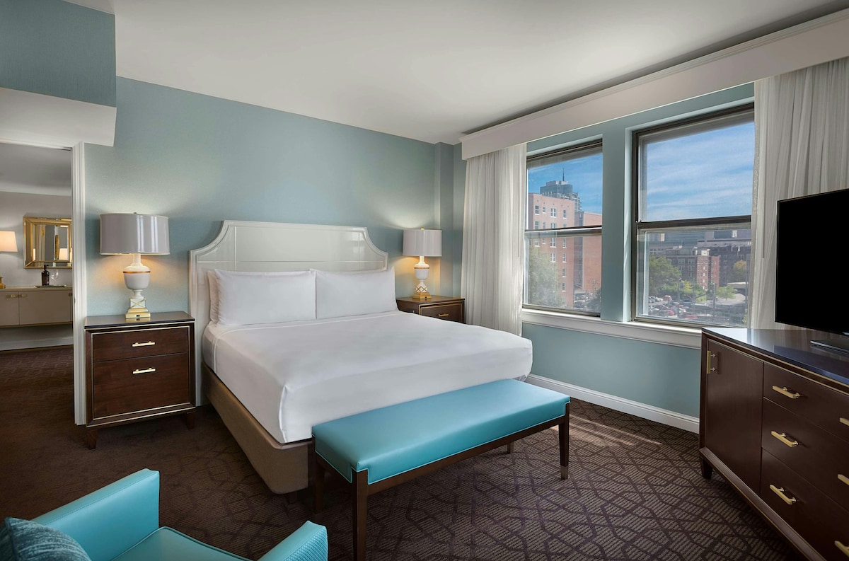 Accessed by a private keyed elevator, this elegant room boasts refined décor, custom hardwood finishes, exquisite furnishings, including a king bed & work desk. Enjoy a marble bathroom, plush robes, mini-bar, Keurig coffee maker, and premium entertainment with Google Chromecast. Thoughtful accessibility features include widened doorways, barrier-free design, and visual alarms for hearing support. Spa-quality toiletries, complimentary Wi-Fi, and comfort-focused amenities ensure a luxurious stay.