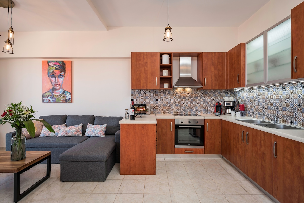 Suite in Stalos, díreach 8km ó bhaile Chania agus 1,7km ó thrá Stalos, cuireann Evora Suites lóistín ar fáil le radharc farraige agus sléibhe le Wi - Fi saor in aisce. Tá aerchóiriú feistithe ar an lóistín, cistin lánfheistithe,teilifíseán ar scáileán cothrom agus seomra folctha príobháideach ina bhfuil cithfholcadán, earraí níocháin saor in aisce agus triomadóir gruaige. Cuirtear cuisneoir, meaisín níocháin agus oigheann ar fáil chomh maith le meaisín caife agus citeal. Cuirtear tuáillí agus línéadach leapa ar fáil freisin.