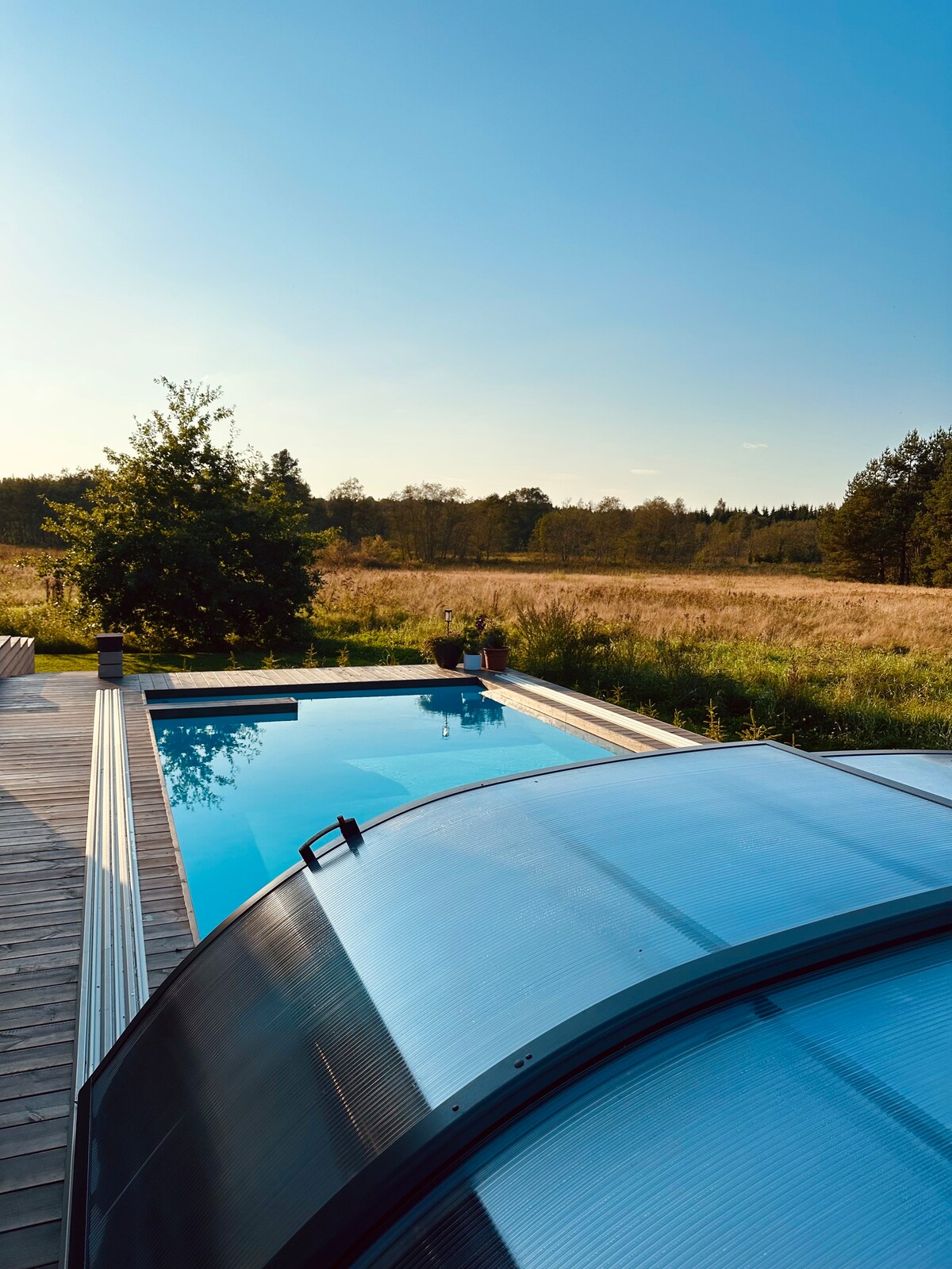 Teach príobháideach raoin, linn snámha, gairdín glasraí méith