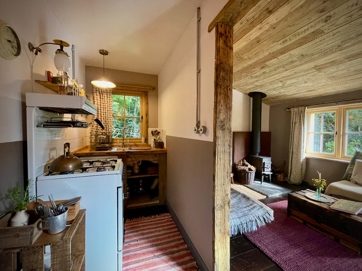 Cábán Woodpecker cúlráideach i bhforaois álainn Dorset