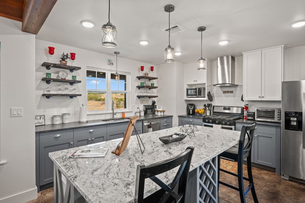 Léigh gach rud le do thoil!! Fairsing atá oiriúnach do theaghlaigh 1900 + troigh chearnach. 3 sheomra leapa 2 1/2 spás folctha i dtrí fhoirgneamh aonaid atá suite díreach i lár thír álainn an fhíona i dTír an Chnoic in Texas. Tá sé ar Highway 290 agus tá go leor fíonlanna díreach nóiméad ar shiúl sa dá threo. Táimid nóiméad ar shiúl ó dhraíocht Fredericksburg agus ó spraoi Luckenbach freisin. Mar sin, bain sult as Tír Fíona Texas Is ionann an bunráta agus 2 aoi agus $ 25 in aghaidh an aoi in aghaidh an lae suas le 6 aoi san iomlán