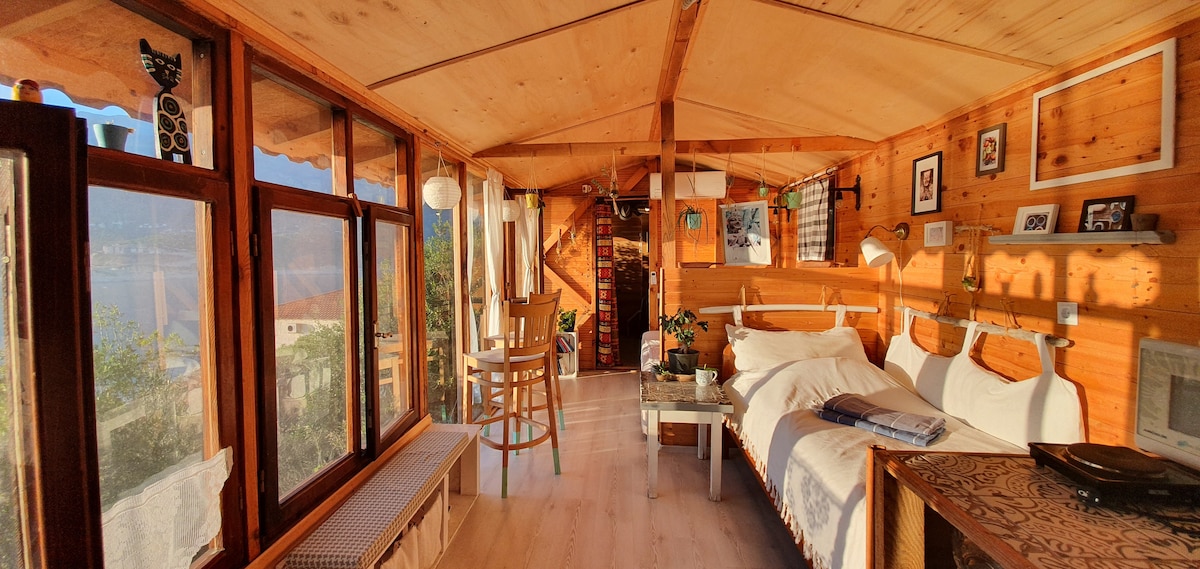 Teach Cloch i bhFeirm. Agus é suite os cionn Kaş, tá radhairc iontacha ar fáil sa tearmann suaimhneach seo den Mheánmhuir agus d'Oileán Meis. Foirfe do lánúineacha agus do dhaoine cruthaitheacha atá ag lorg inspioráide, tá saoráidí nua - aimseartha, ardán fairsing, agus maireachtáil gan stró laistigh den taobh amuigh sa teach. Faigh suaimhneas agus áilleacht nádúrtha sa tearmann uathúil seo ar thaobh cnoic.
