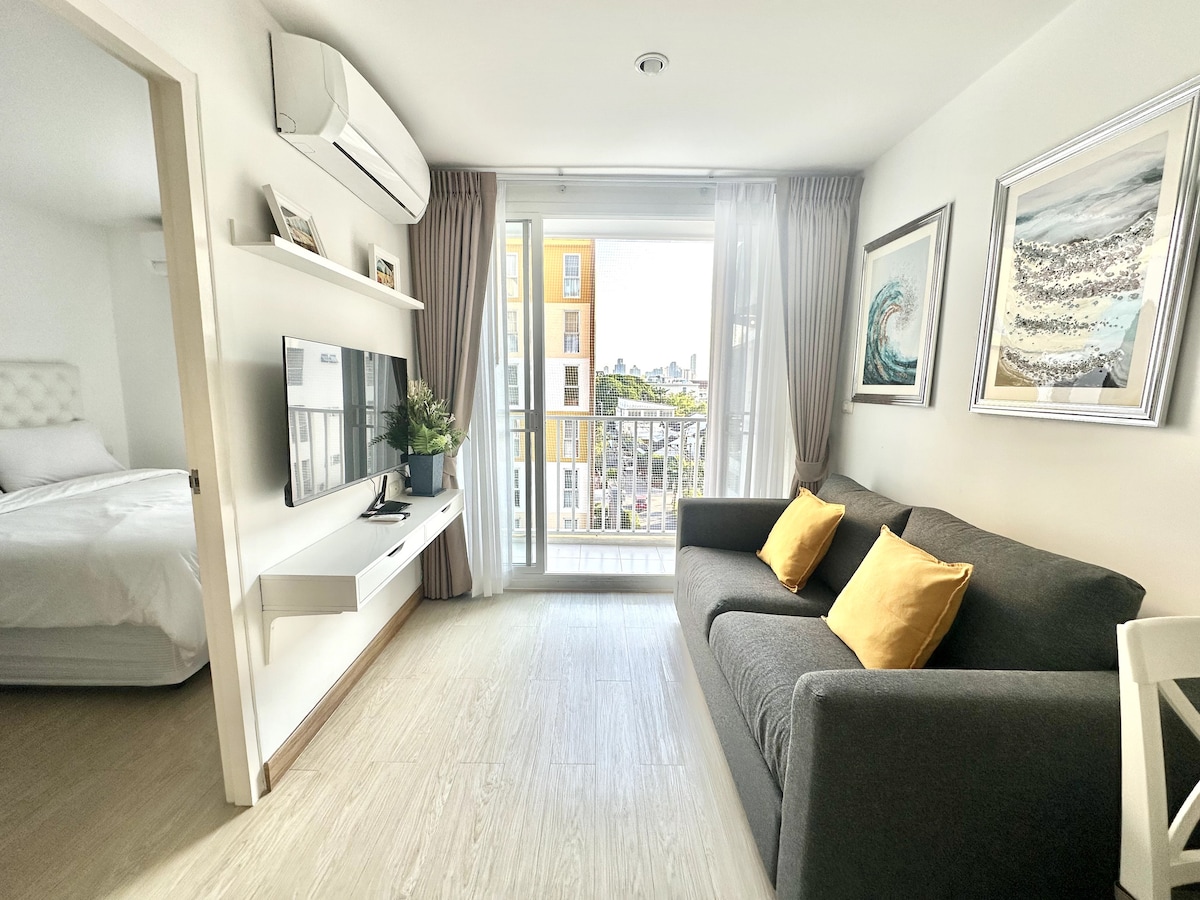 Faigh blaiseadh d'fhanacht compordach san árasán 1 sheomra leapa seo atá feistithe go hiomlán (30 méadar cearnach) ar an 6ú hurlár. Lonnaithe díreach siúlóid 10 nóiméad ó Onnut BTS, Tesco Lotus, agus Century Mall, le bia sráide bríomhar agus Margadh Oíche nua Onnut in aice láimhe. Bain sult as saoráidí amhail aerchóiriú, teilifís, Wi - Fi ardluais, meaisín níocháin, agus cistin atá feistithe go hiomlán. Rochtain saor in aisce ar linn snámha, seomra aclaíochta, agus slándáil foirgnimh 24/7. Tá gach bille san áireamh (uisce, idirlíon, leictreachas).