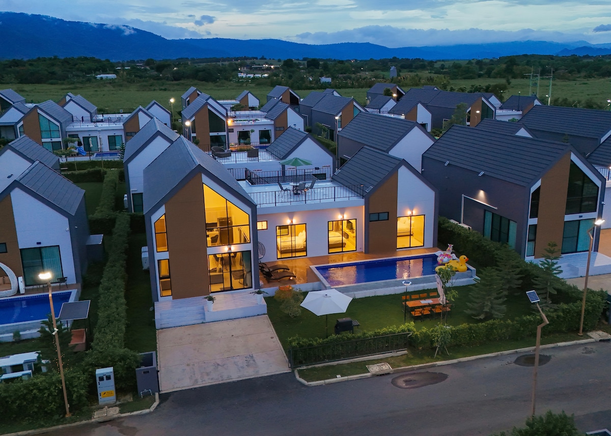 Éalaigh go dtí an tearmann cluthar tí feirme seo i sliabh Khao Yai Tieng! Snáithíní feirme foirfe do 8 go 10 n - aoi, ag tairiscint teach mór agus teach beag bídeach taobh le taobh. - Bain sult as tearmann sa bhaile agus lig do scíth -3 sheomra leapa agus 3 sheomra folctha - Rooftop le radhairc sléibhe Spás lasmuigh agus campála Glasraí le haghaidh cócaireachta - Bain sult as cóisirí ag an mbord fada -65” TV le PS4, Netflix ,agus Karaoke