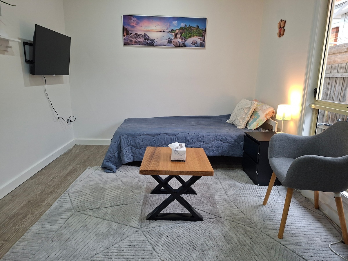 STIÚIDEO FÉINCHUIMSITHEACH le HIONTRÁIL PHRÍOBHÁIDEACH agus CLÓS. Níos lú ná 15min tiomáint chuig Aerfort Melbourne agus 25 -30min go CBD. Féinseiceáil ÉASCA isteach LE glas dorais leictreonach. ◈ Cistin Lánmhéide Leaba Bhanríona ◈ Compordach Seomra Folctha ◈ Bia agus Tearmann ◈ Nua - Aimseartha ✔Aerchóiriú Wi - Fi ✔saor ✔in aisce +Chromecast Tá ár Stiúideo suite i gceantar ciúin sábháilte leis an gcomharsanacht dheas, iontach le haghaidh siúlóidí tráthnóna, níos faide ar shiúl ó shaol gnóthach na hoíche agus ó chóisirí glóracha. Foirfe do thaistealaithe Gnó nó fanacht rómánsúil