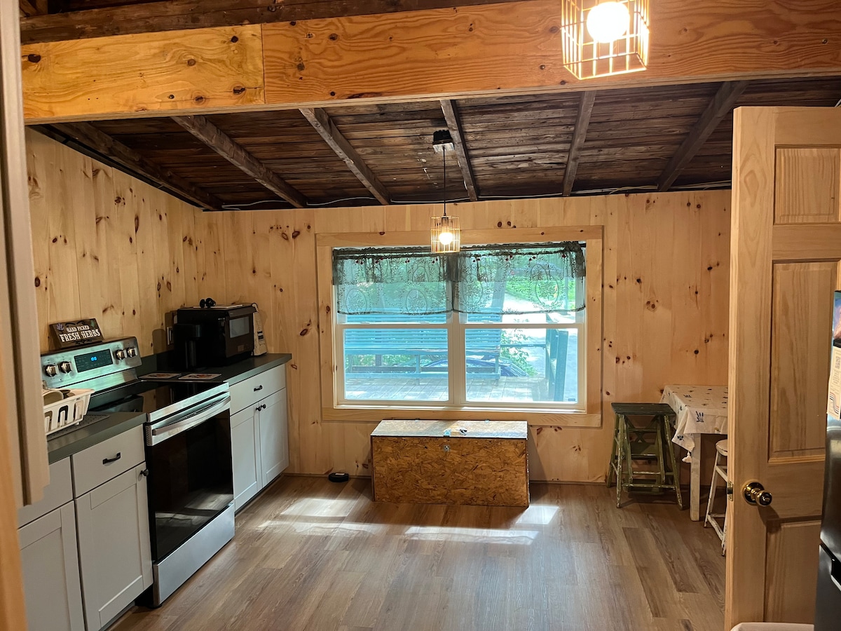Tá an tearmann cábáin seo suite ar ghlanadh nádúrtha sa Mt Glas álainn. Forrest. Timpeallaithe ag garrán dlúth de chrainn spruce tugann tú príobháideacht iomlán. Níl ann ach tiomáint tapa 5 nóiméad chuig bialanna, grúdlanna agus siopaí iontacha i lár Wilmington. Tá sé níos lú ná 20 nóiméad go Mt freisin. Sneachta. Tá fánaíocht iontach ag Páirc Stáit Molly Stark díreach trasna na sráide agus lochanna iontacha laistigh de thiomáint 10 nóiméad! Níl aon seirbhís WI - FI ná fón póca iontach agus mar sin is áit iontach í le díphlugáil!