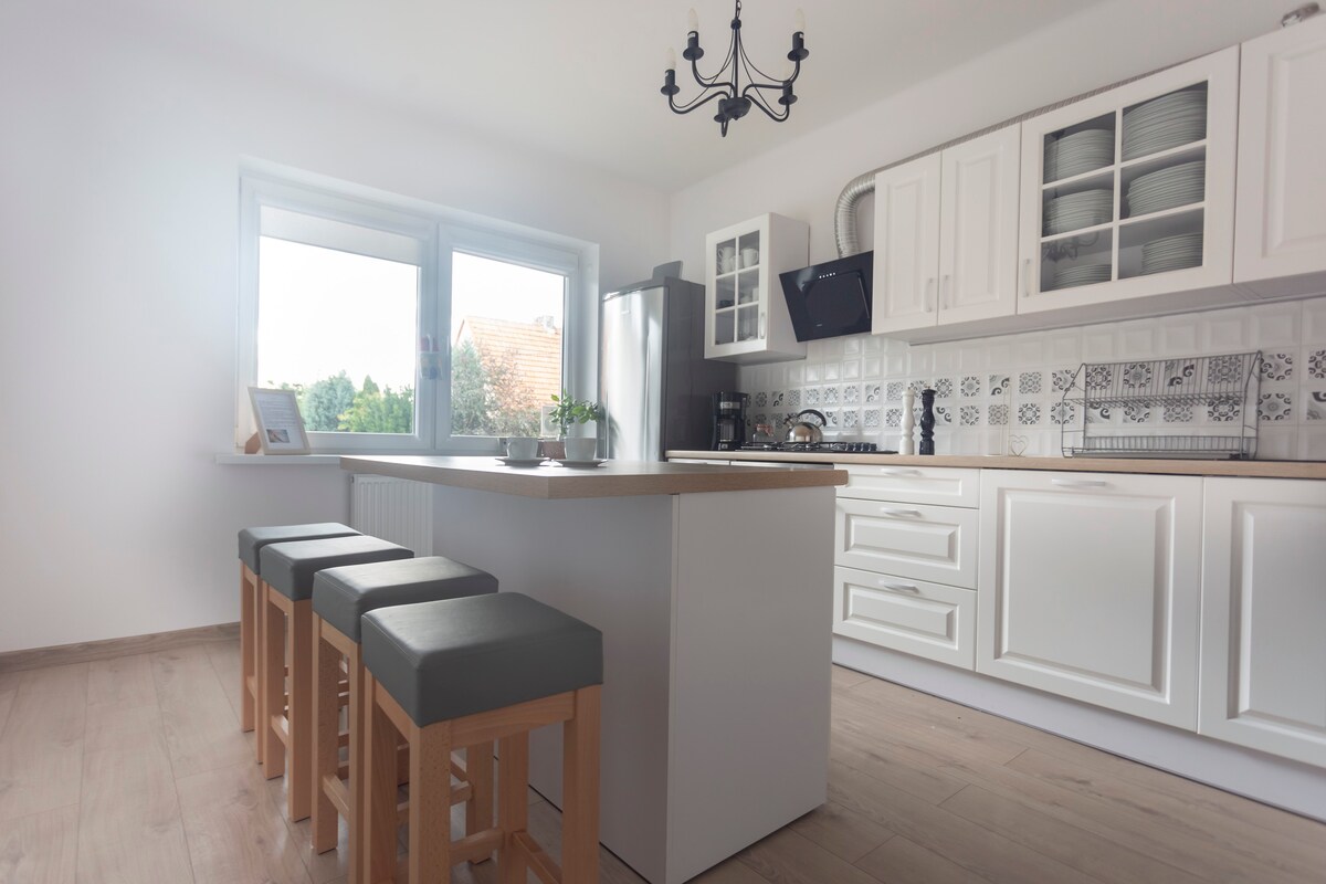 Tá an teach ar an escarpment suite ar shiúl ó na hustle agus bustle. Tá na fuinneoga os cionn Loch Motława agus díreach in aice leis tá foraois a bhaineann le Ceantar Loch Iławskie, a bhfuil cáil uirthi mar gheall ar a ghar do 100 loch agus foraois atá saibhir i bhflóra agus fána éagsúla. Maidir le díograiseoirí fóillíochta gníomhacha, tá rothair siúlóide, SUPanna, cadhc, pontún ullmhaithe againn agus an fhéidearthacht bád seoltóireachta a ligean ar cíos. Agus thar aon rud eile, tá atmaisféar sa teach a fhágann nach mian leat é a fhágáil.