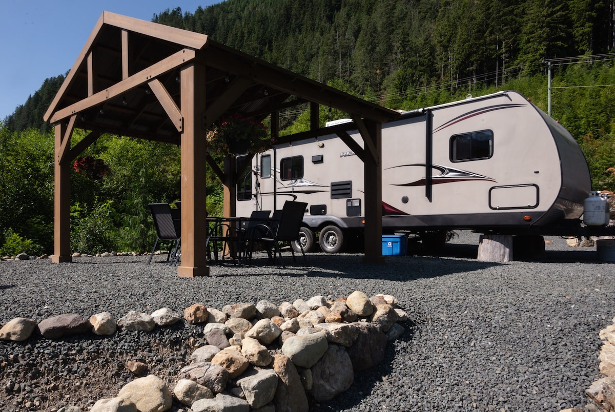 Fáilte go dtí Feirm Tahsis, réadmhaoin 187 acra (76 heicteár) atá suite 3km siar ó dheas ó Tahsis ar thaobh sléibhe creagach géar, le trá mhéaróg, eas 90 troigh in aice láimhe, agus radhairc iontacha de Shliabh Tahsis, Mt McKelvie agus Sliabh Garbh. Is éard atá i láithreán Mount Bate ná leantóir Jayco 175RD SLX 2018 atá feistithe leis na saoráidí bunúsacha go léir: gazebo le soilsiú paitió, beárbaiciú, agus tábla dóiteáin própáin. Tá cosán príobháideach ar an láithreán seo freisin a théann chuig áit suí ina bhfuil cathaoireacha paitió.