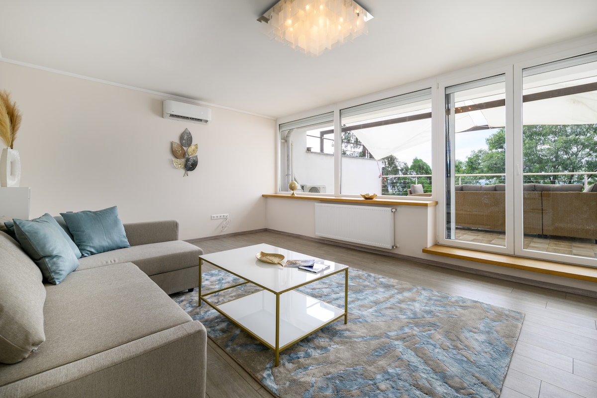 Tá an t - árasán só athchóirithe seo deartha agus cruthaithe ag dearthóirí intí a bhfuil duaiseanna buaite acu chun na caighdeáin is airde a thabhairt duit i ngach slí. Má theastaíonn áit uait chun do scíth a ligean i do chompord agus i stíl, níl cuma ar bith air a thuilleadh. Suite go foirfe i sráid chiúin díreach taobh thiar de Halla an Mhargaidh Mhóir cáiliúil agus díreach cúpla céim ó bhruach na Danóibe agus ó Dhroichead na Saoirse ní féidir leis an suíomh a bheith níos fearr. Tá stáisiún Metro 3 agus 4 agus an "fámaireacht" tram #2 "4 nóiméad ar shiúl.