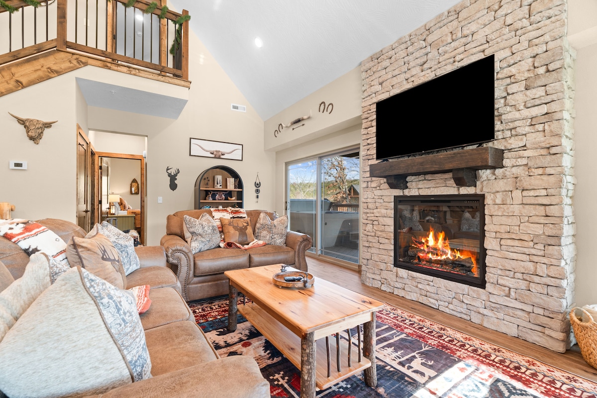 Lig do scíth agus lig do scíth i do chábán álainn, síochánta féin le radharc tosaigh ar mhachairí Loch Taneycomo. Féach ar an ngrian ag bualadh an ghormáin agus í ag luí ón bpoll dóiteáin teolaí, ón deic fhairsing nó ón seomra gréine faoi iamh. Bíodh meas agat ar an gcanú adhmaid barántúil, agus ar obair adhmaid gharbh logáilte láimhe álainn agus tú cuachta suas os comhair an teallaigh.