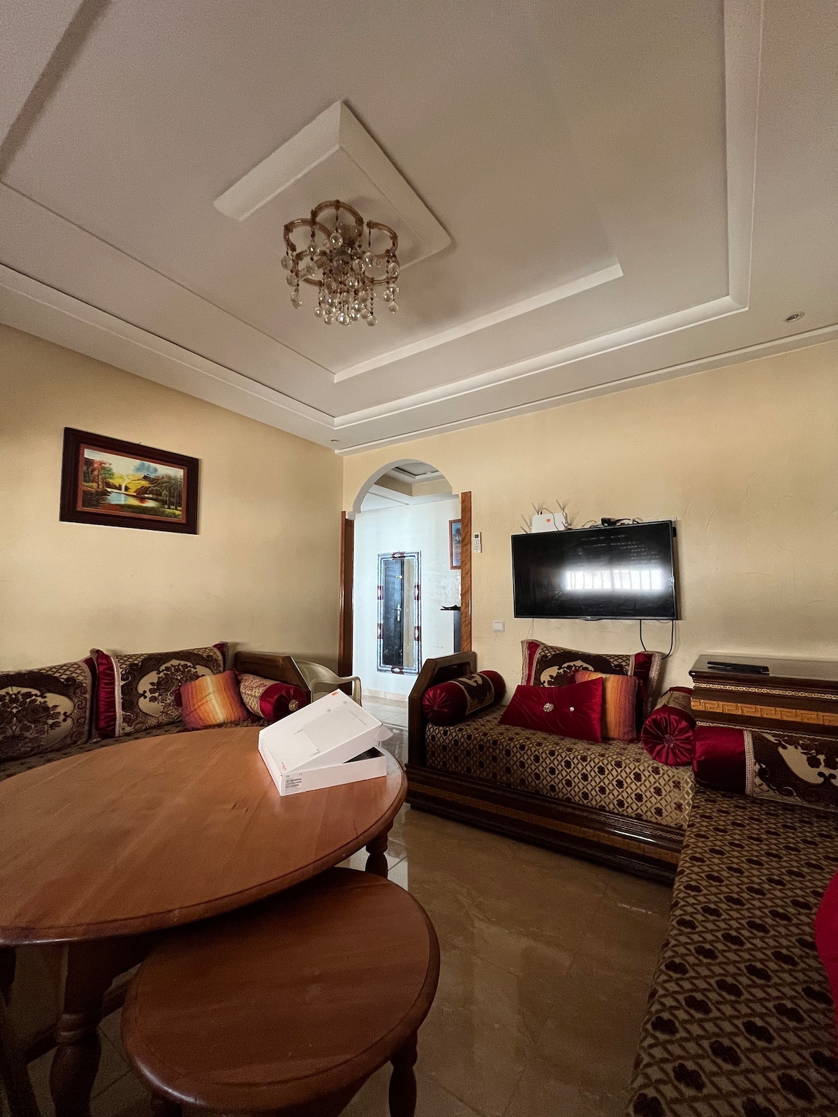Appartement spacieux, lumineux et très bien équipé avec vue sur jardin . L'appartement est situé dans une résidence sécurisée et fermée, comptant une épicerie à l'entrée, avec disponibilité d'un parking privé à l'intérieur de la résidence gratuit et surveillé. A partir de l'aéroport des grands taxi sont disponibles (24h/24 et 7jours/7) jusqu'à la résidence (prix de la course est de 300 dhs, environ 30 euros). L’appartement est situé à 5 min de Carrefour et 15 min de la plage.