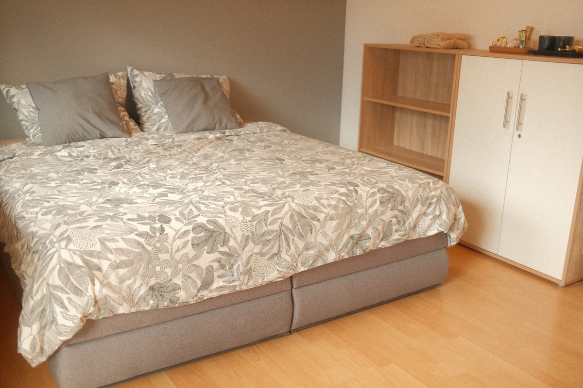 Tá ár dteach aíochta fairsing dhá stór suite go díreach inár ngairdín, tá faiche agus crainn timpeall air agus tugann sé cuireadh duit luí ar 43 méadar cearnach lena chóngaracht. Sa leaba bhuinc mhuirí, is fíor aislingí na bpáistí agus ós rud é go bhfuil beirt pháistí (2 agus 6 bliana d'aois) againn féin, tá boscaí gainimh, trampailín agus feithiclí éagsúla réidh le súgradh. Tá leithreas suiteáilte sa teach aíochta féin, is féidir leat cithfholcadh a ghlacadh i do chithfholcadán/leithreas Airbnb féin in íoslach ár dteach béal dorais.