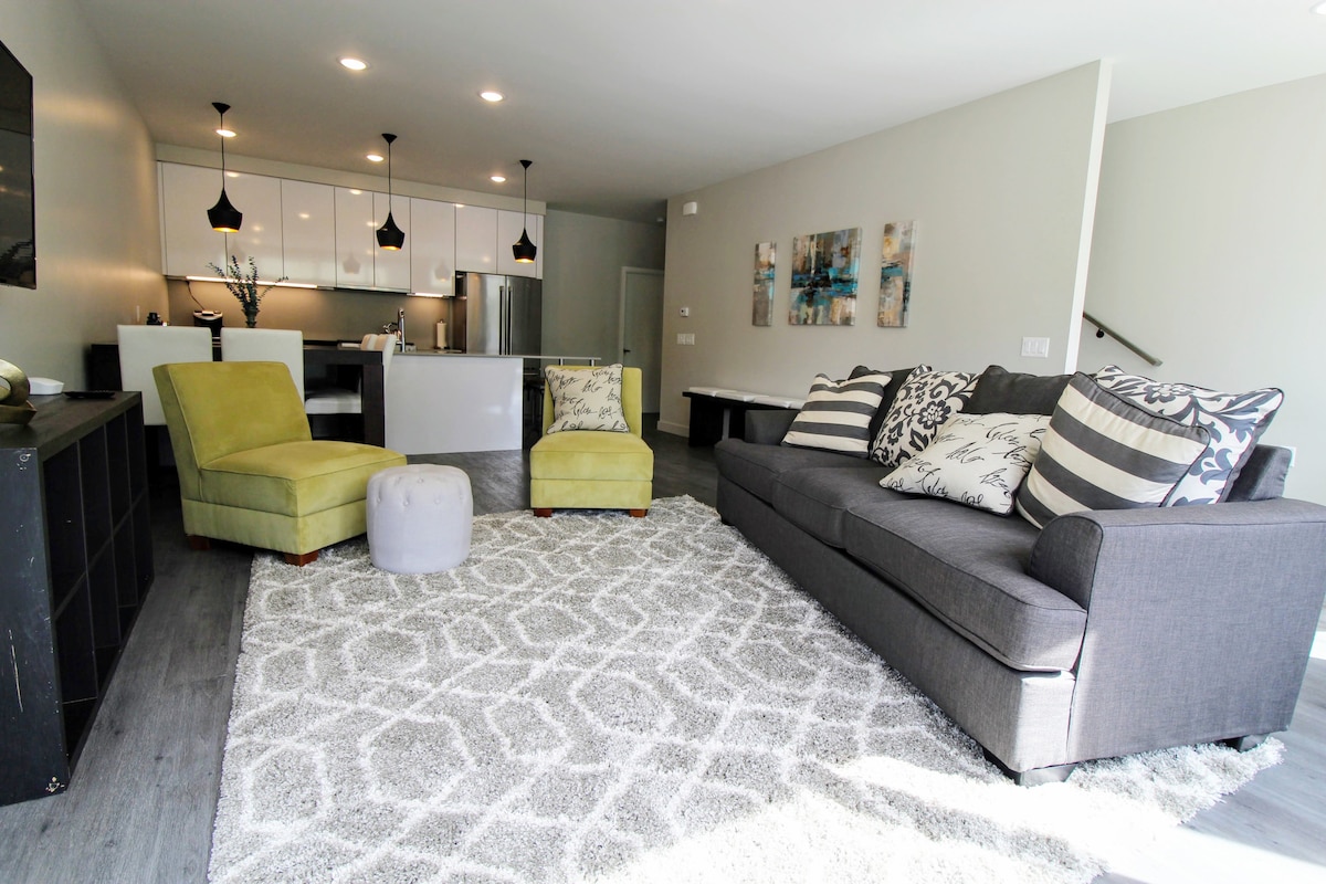 An áit fhoirfe le fanacht le haghaidh oibre nó súgartha (nó stad thar oíche tríd an mbaile)! Cuach suas os comhair an teallaigh ar an tolg lánmhéide agus déan na seónna is fearr leat a shruthlú ar an teilifís 48"extraord (Netflix amháin, gan cábla ar bith) nó glac sos ó scíth a ligean agus roinnt oibre a dhéanamh ar an deasc. Ith takeout ar an tábla ard sa chistin nó déan do bhéile féin leis an gcistin lánmhéide. Tá an áit stocáilte go hiomlán, ó mhiasa agus sceanra, tuáillí agus braillíní úra, go gallúnach agus seampú.