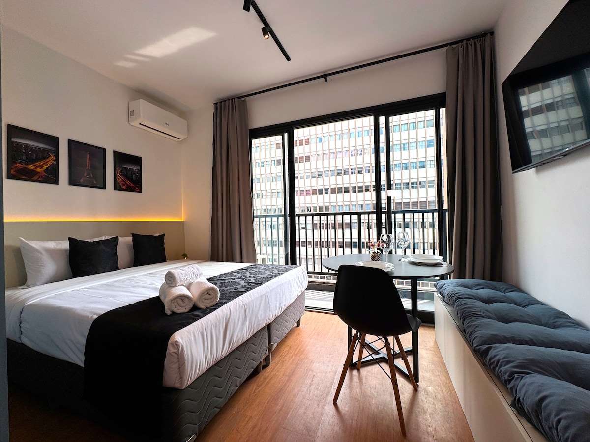 Lonnaithe i bhFoirgneamh íocónach Copan le radhairc iontacha ón 27ú hurlár! Stiúideo críochnaithe le gach rud a theastaíonn uait le haghaidh fanacht dodhearmadta i lár São Paulo. Ag meabhrú go bhfuil an t - uisce ó sconna na cistine scagtha. ✨ Leaba de mhéid banríona Teilifís 📺Chliste 50” 🍽 Cistin fheistithe 💧 Uisce scagtha 🌆 Radharc saor in aisce, gan scáileán cosanta In aice leis na bialanna is fearr agus na príomhradhairc. Beo taobh istigh den fhoirgneamh cónaithe is cáiliúla sa Bhrasaíl — sárshaothar Oscar Niemeyer.