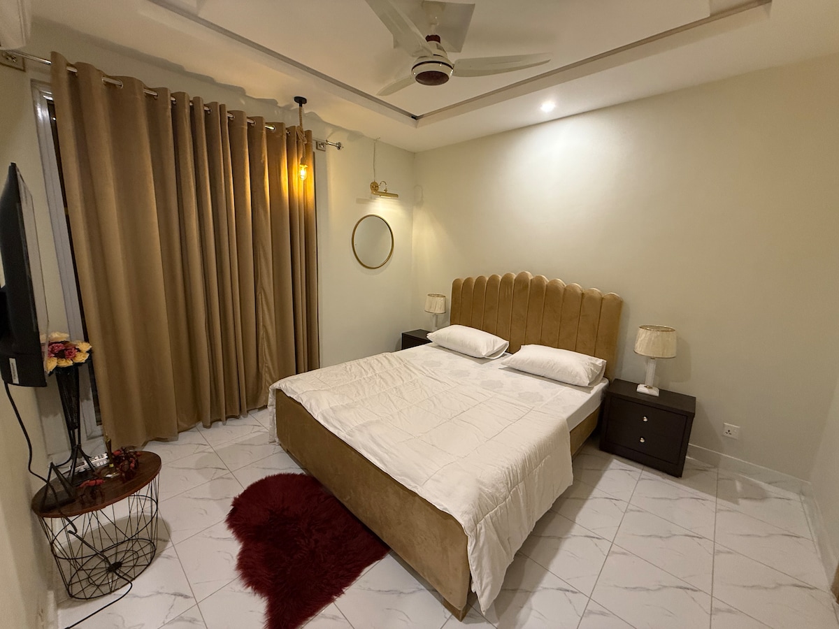 Árasán 2BHK Nua – Aimseartha – Compord & Stíl Fáilte go dtí do theach ar shiúl ón mbaile! Cuireann an 2bhk seo atá deartha go hálainn meascán foirfe compoird ar fáil! ✨ Gnéithe: - Meall Amazon eile inar féidir le haíonna margaí agus caife Sheesha ar an díon a fháil - 3 nóiméad sa charr ó Giga Mall - an t - ionad siopadóireachta is mó sa chathair. - 2 nóiméad ó bhácús cáiliúil Tehzeeb agus ó bhialanna fuara eile. - 8 nóiméad ó padel atá suite i Dha 2. - 7 nóiméad ó bhealach isteach Dha 2 áit a bhfuil áiteanna cáiliúla sa pháirc láir