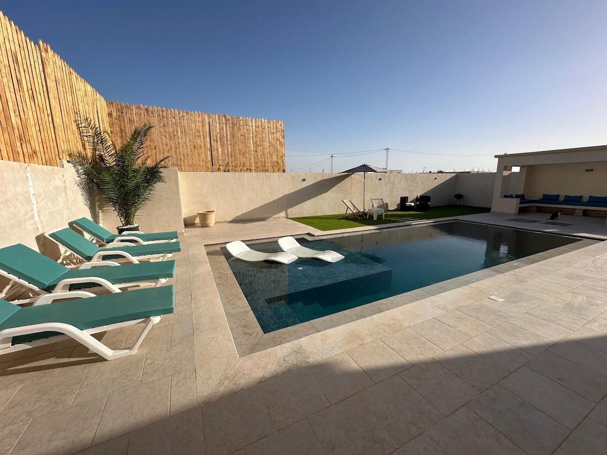 🌴 Fáilte go Villa Eden – Do Shos Suaimhneach in Sunny Djerba ✨ Spásanna • 190 m² de chompord nua - aimseartha agus scagtha • 3 sheomra mhóra ina bhfuil éadaí leapa den scoth • 3 sheomra folctha, 🌿 An gairdín agus an linn snámha • Linn snámha phríobháideach shlán • Ardán le tolglann agus cathaoireacha deice lasmuigh • Áit bheárbaiciú do do bhéilí diongbháilte 🏡 Saoráidí • Cistin lánfheistithe (oigheann, micreathonnán) • Aerchóiriú i ngach seomra • Wi - Fi ardluais • Meaisín níocháin